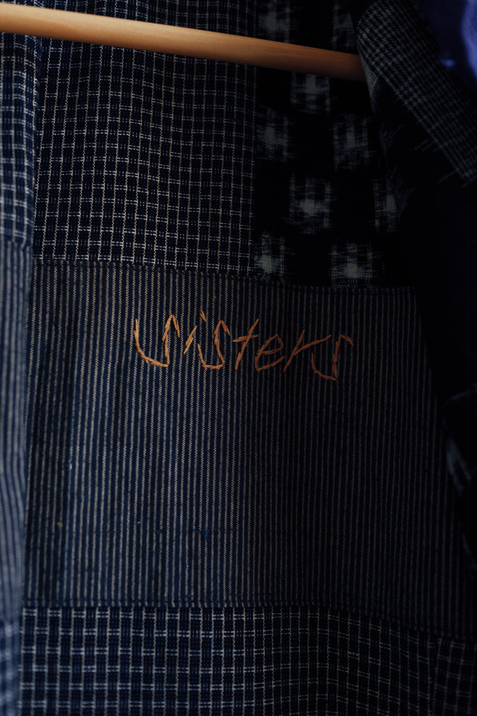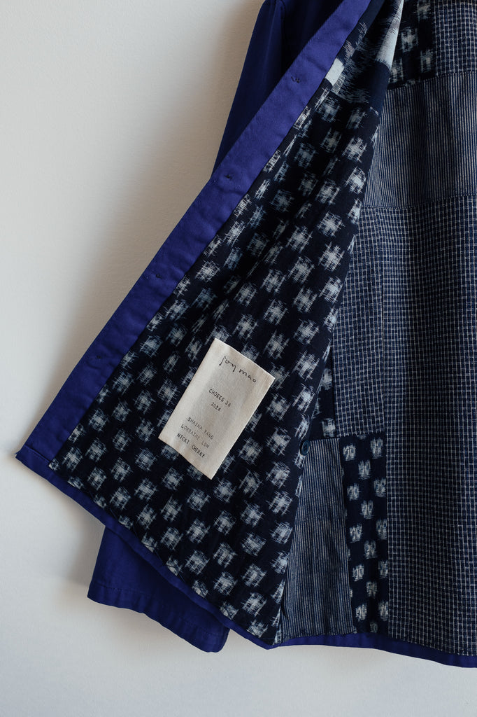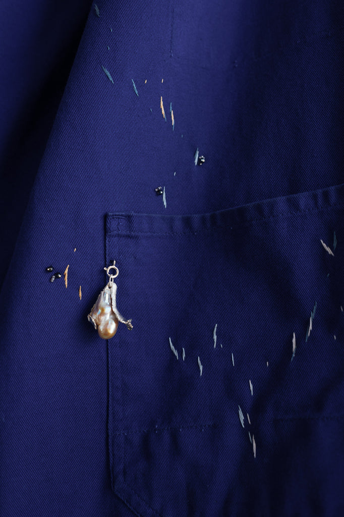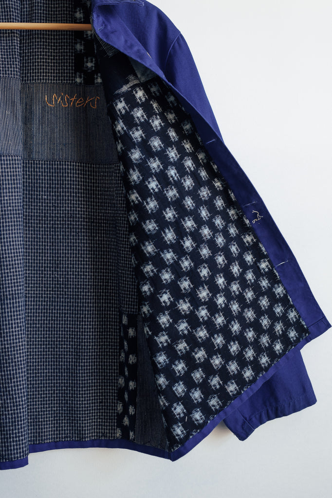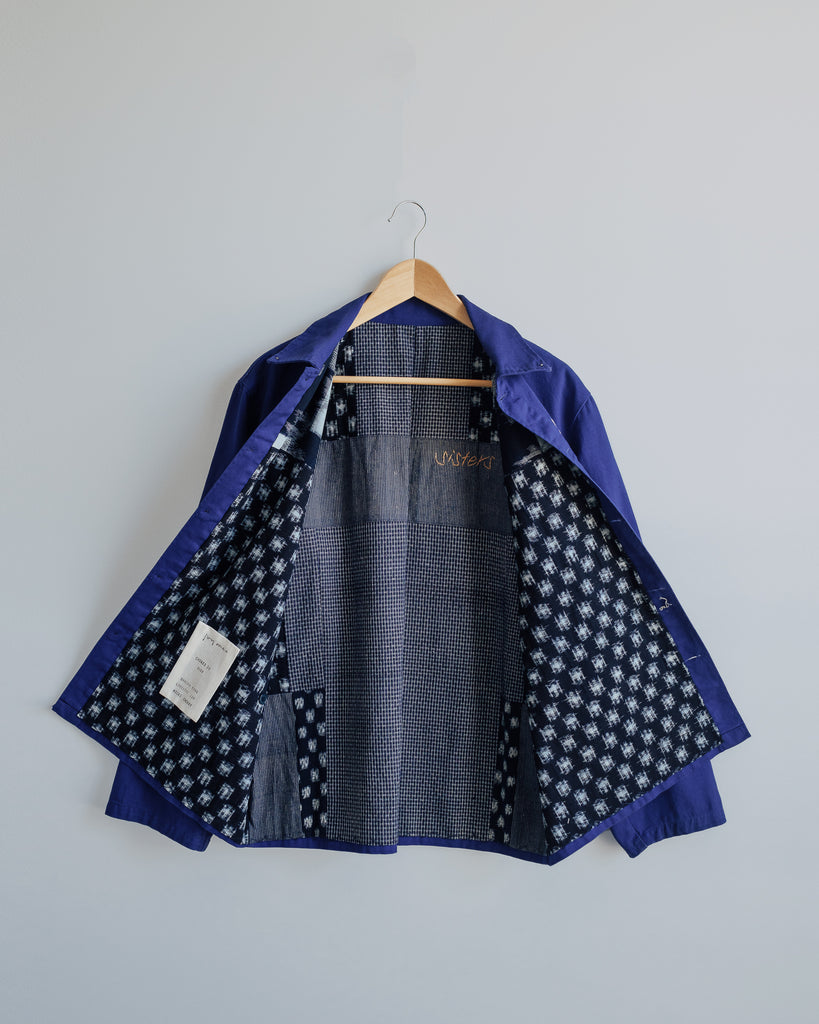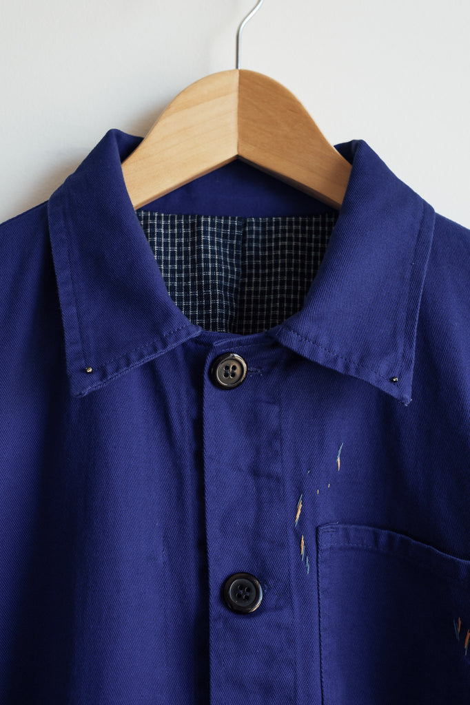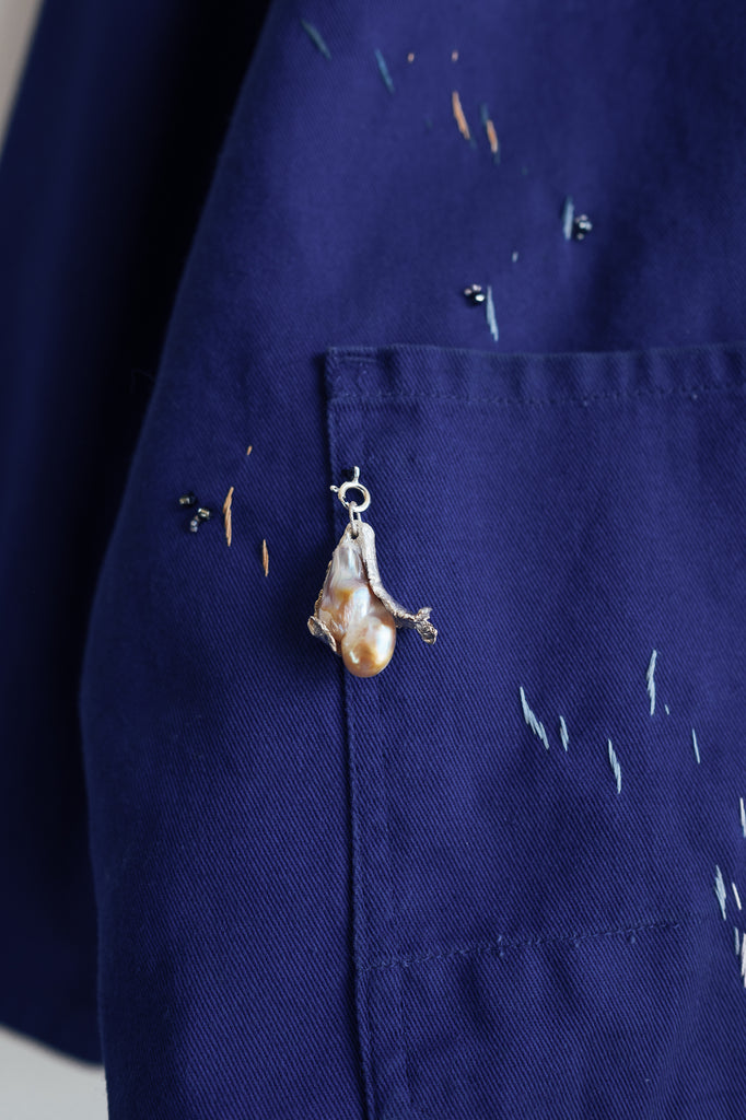 Vintage chore coat (cotton or cotton blend), patchwork lining constructed from antique indigo-dyed cotton fabric scraps, cotton embroidery floss, blister pearl and silver charm, glass beads