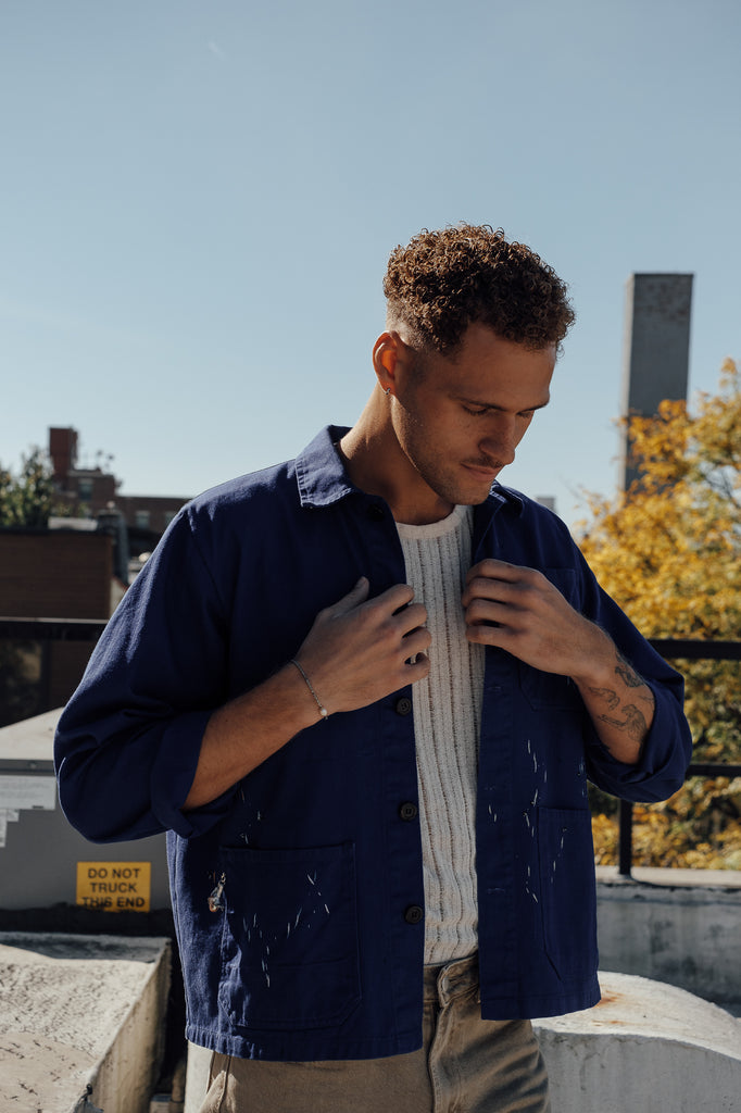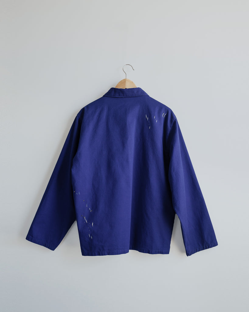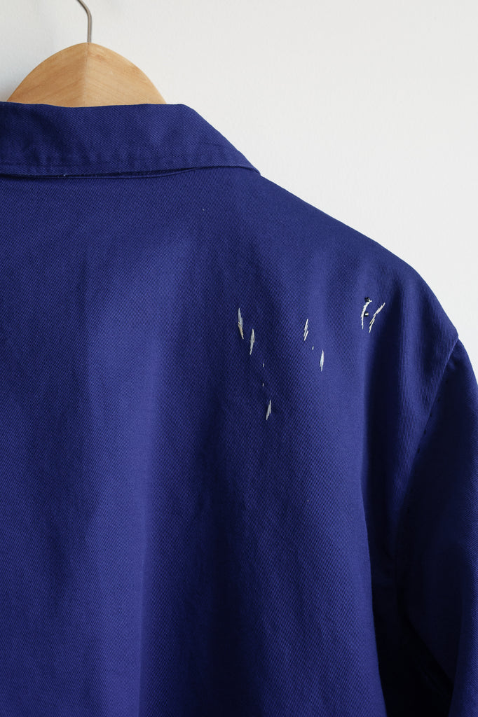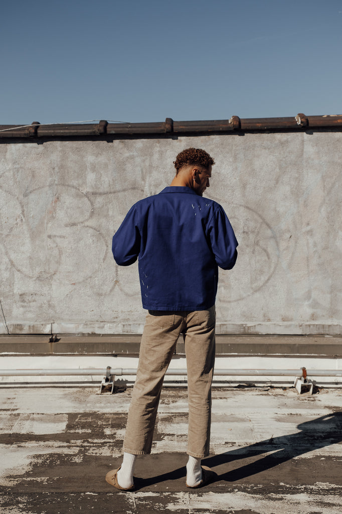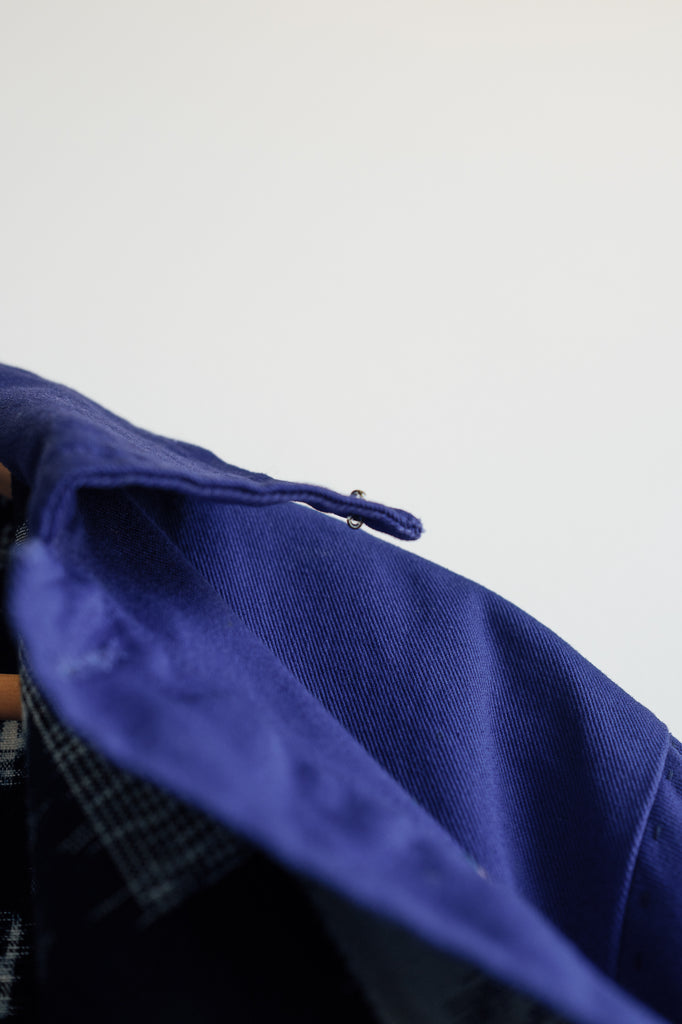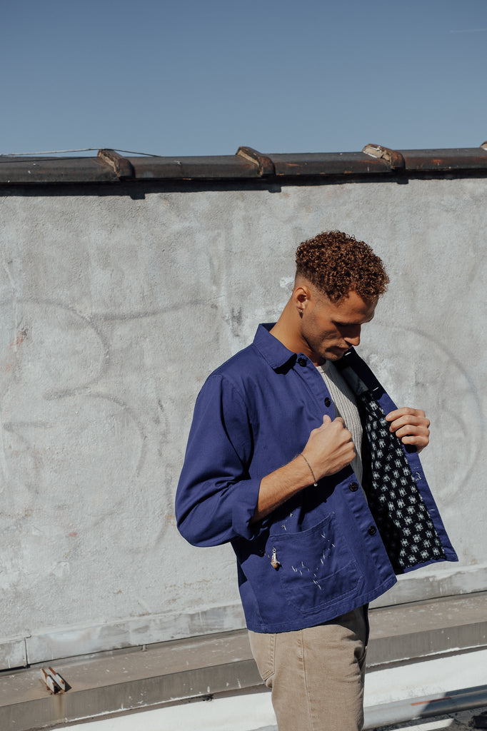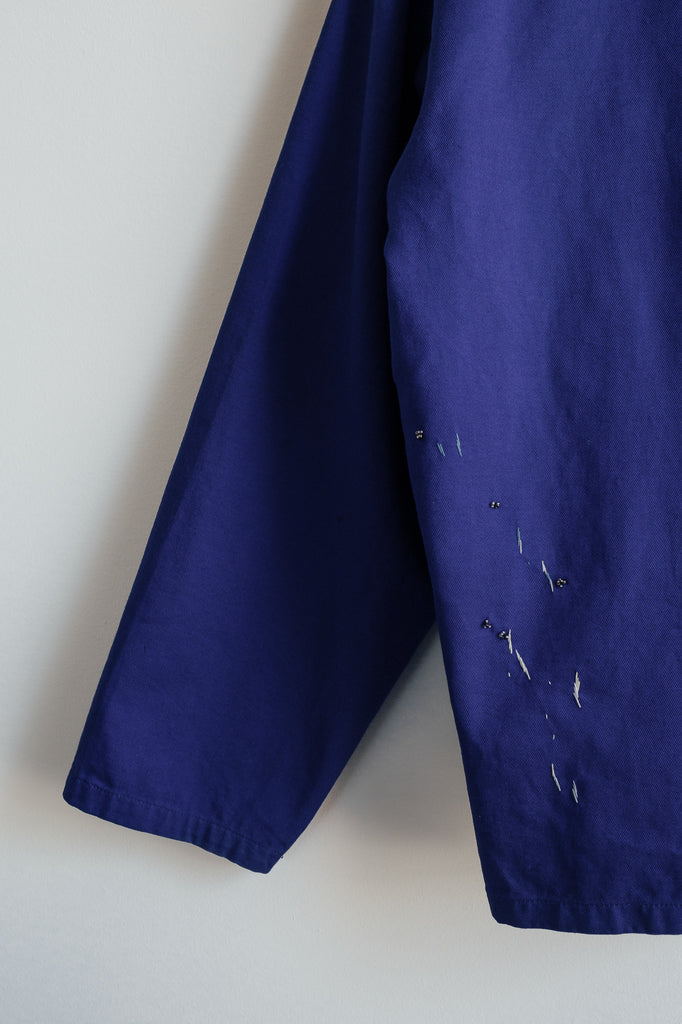 Vintage chore coat (cotton or cotton blend), patchwork lining constructed from antique indigo-dyed cotton fabric scraps, cotton embroidery floss, blister pearl and silver charm, glass beads