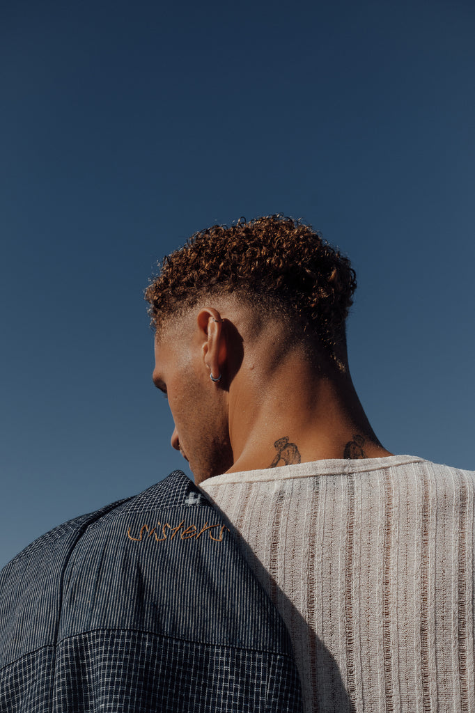 38 sisters holds with her a delicacy of intention with every stitch and every bead — from the double-beaded points at her collar to the trails of embroidery tracing secret lines across the purplish blue of her only slightly-worn-in fabric. Inside, her lining is beautifully patchworked, mirroring and celebrating the multiplicity that binds together her namesakes, in whatever form they may take shape. Her Nicki Cherry charm beckons gently from her right side pocket, inviting its wearer to open their heart and join in the dance.