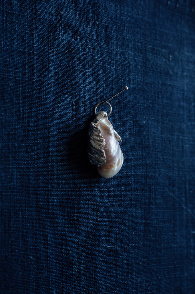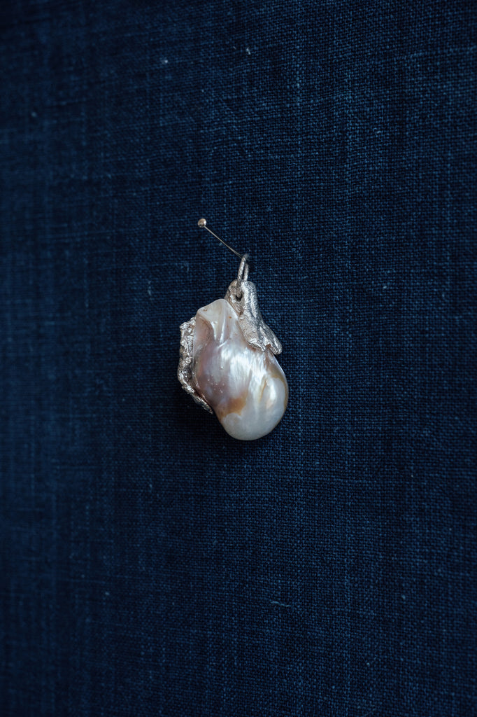 Each charm features a blister pearl held firmly — yet incredulously, as if defying the laws of physics — in place by sculpted silver. The unique silver clay process behind their union carries with it a record of touch and fluid motion solidified in time, each unreplicable, even by its maker.