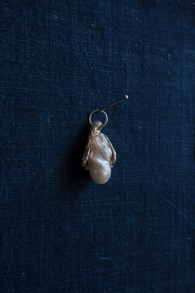 Each charm features a blister pearl held firmly — yet incredulously, as if defying the laws of physics — in place by sculpted silver. The unique silver clay process behind their union carries with it a record of touch and fluid motion solidified in time, each unreplicable, even by its maker.