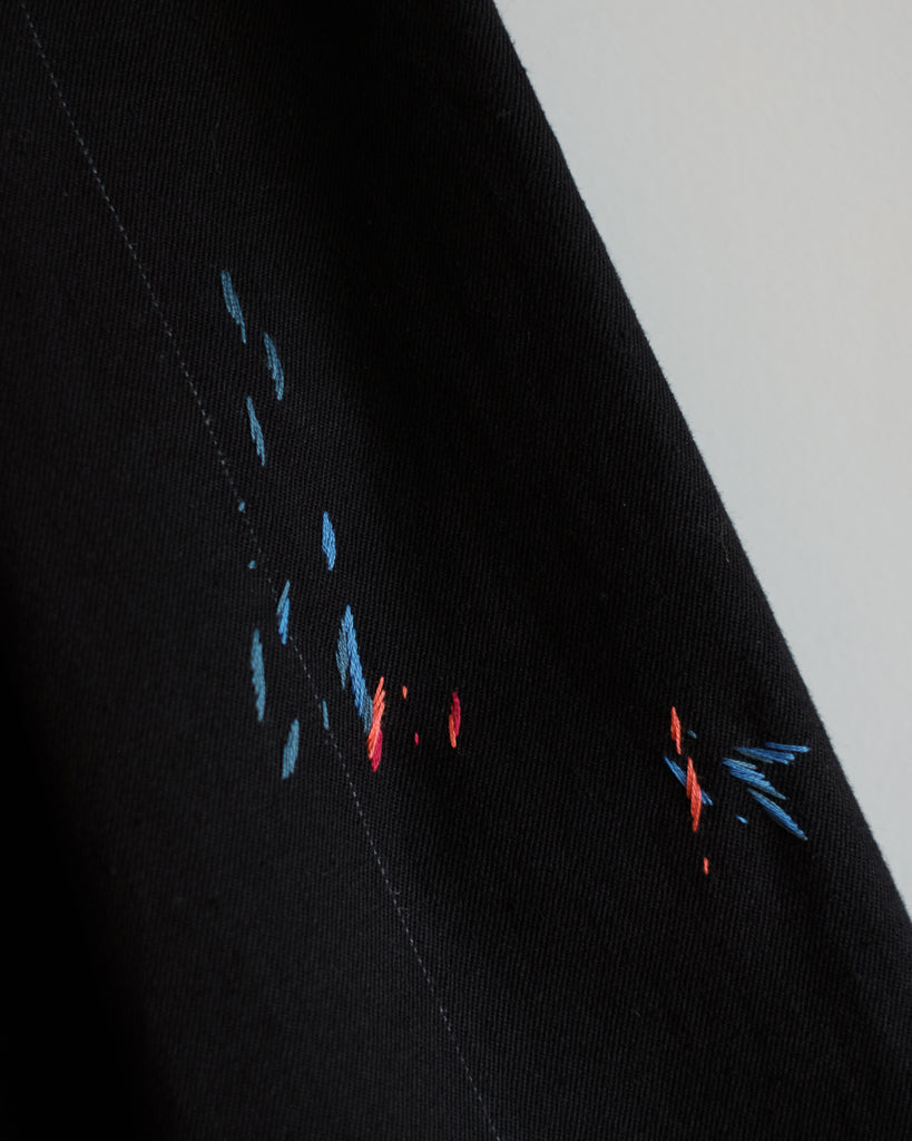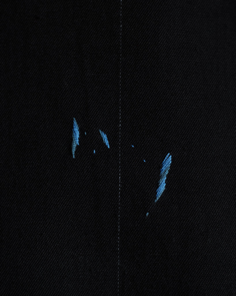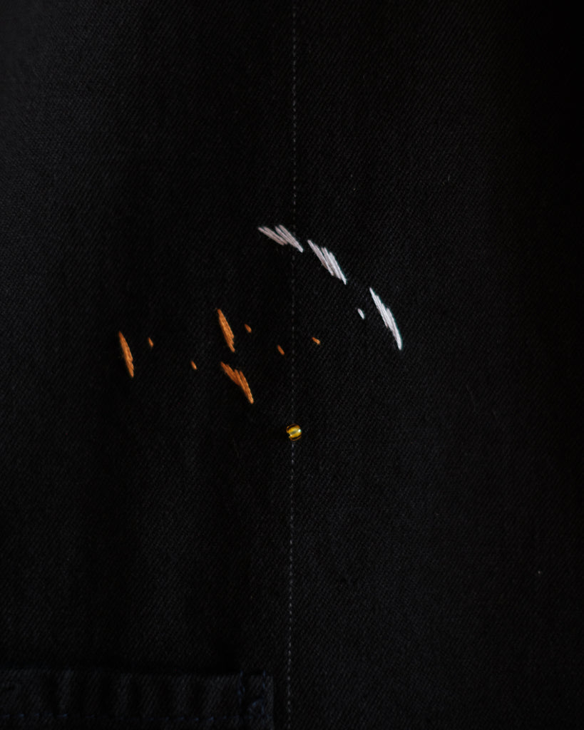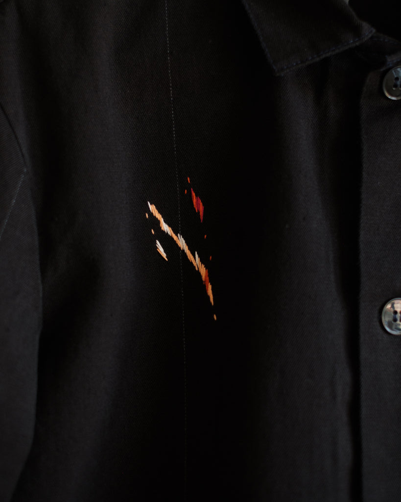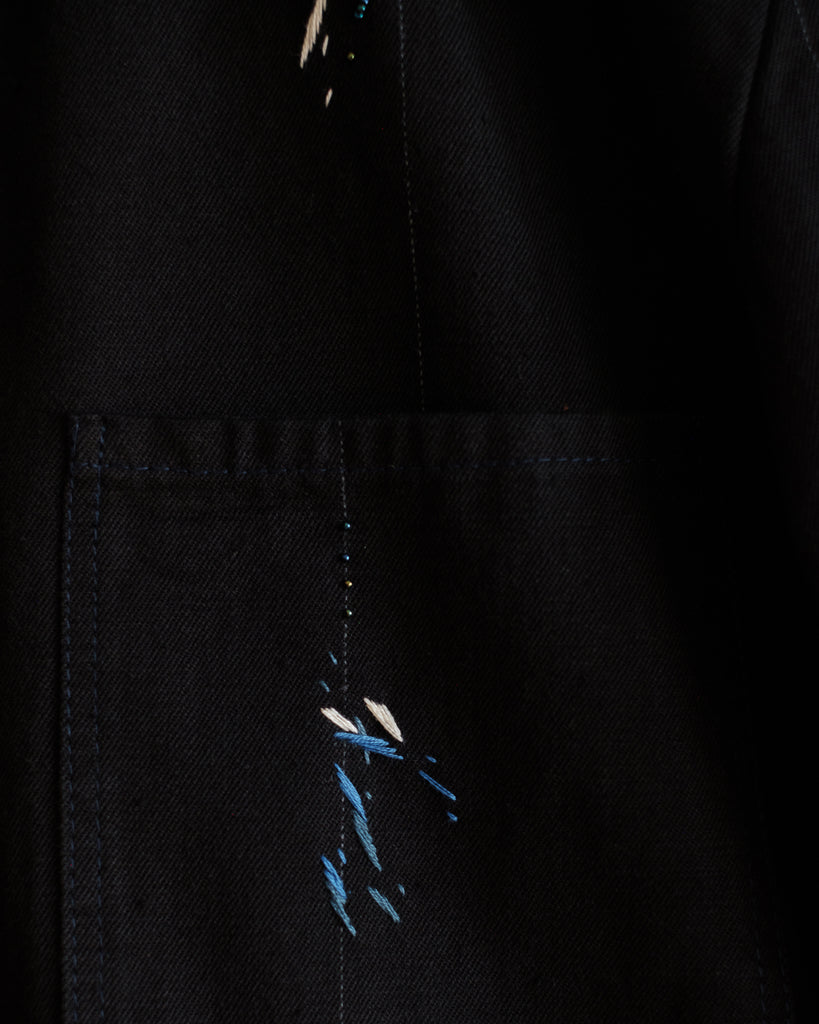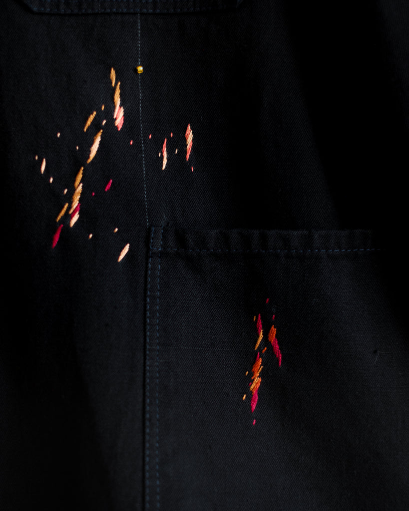 Chores is a collection of eighteen hand-embroidered vintage chore coats, celebrating the beauty of earnest labor. Each piece is a vintage garment transformed through a unique pattern of hand-embroidery, inspired by the unintentional yet beautiful splatters left on an old painting smock.