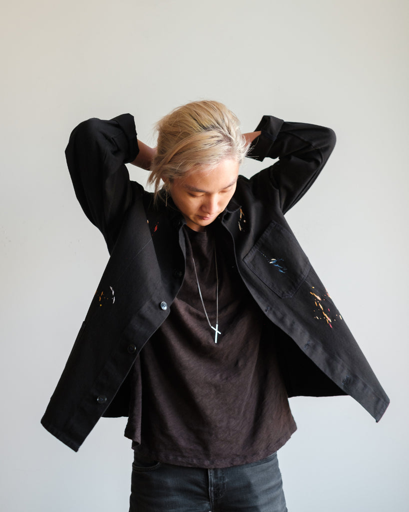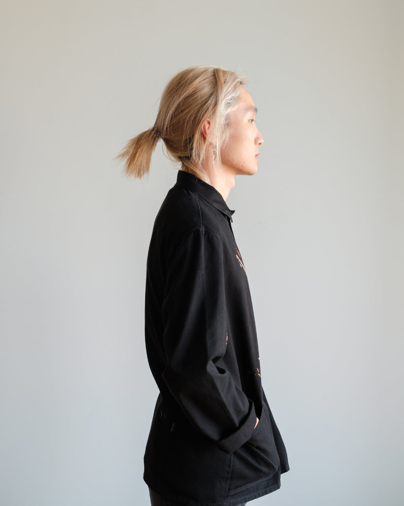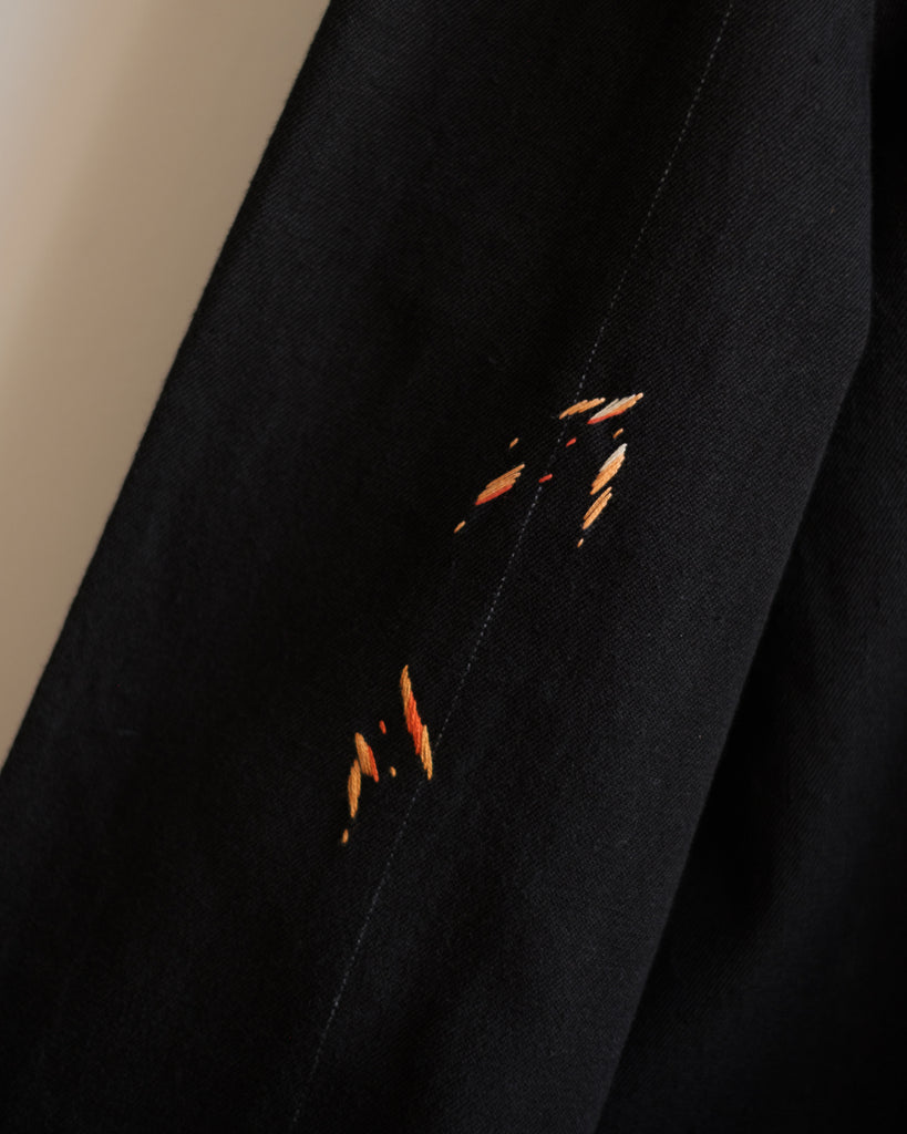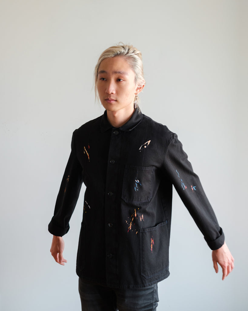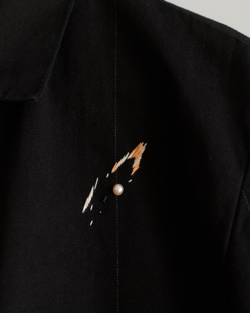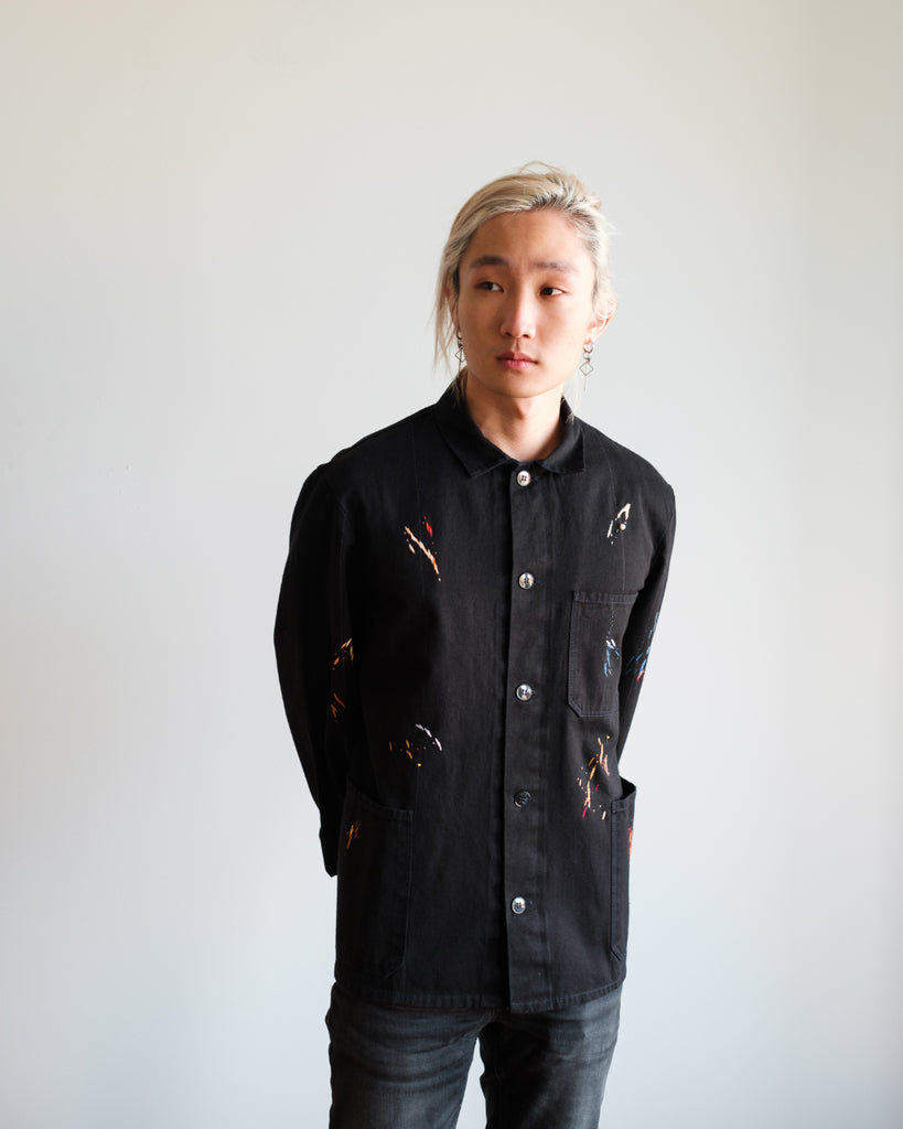 Chores is a collection of eighteen hand-embroidered vintage chore coats, celebrating the beauty of earnest labor. Each piece is a vintage garment transformed through a unique pattern of hand-embroidery, inspired by the unintentional yet beautiful splatters left on an old painting smock.