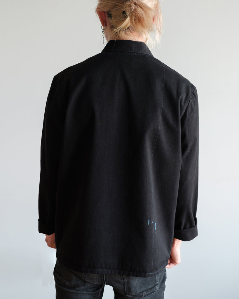 The fabric is a mid to heavyweight cotton twill with dark blue stitching, structured and durable. It is in great condition, with no noticeable wear and tear. The fabric of the garment also has a unique feature—a single white warp thread—deliberately cut to run vertically on each panel (front, back, pockets, sleeves). The embroidery complements this fabric detail.