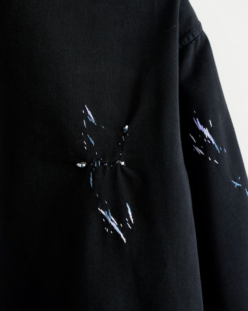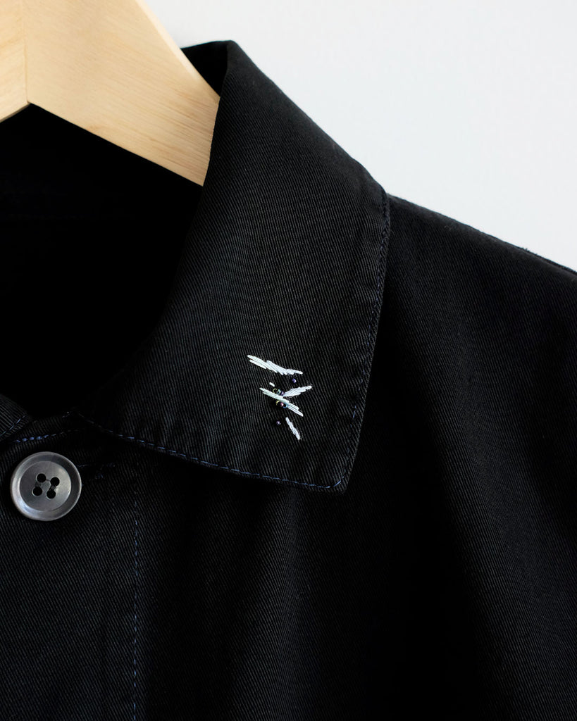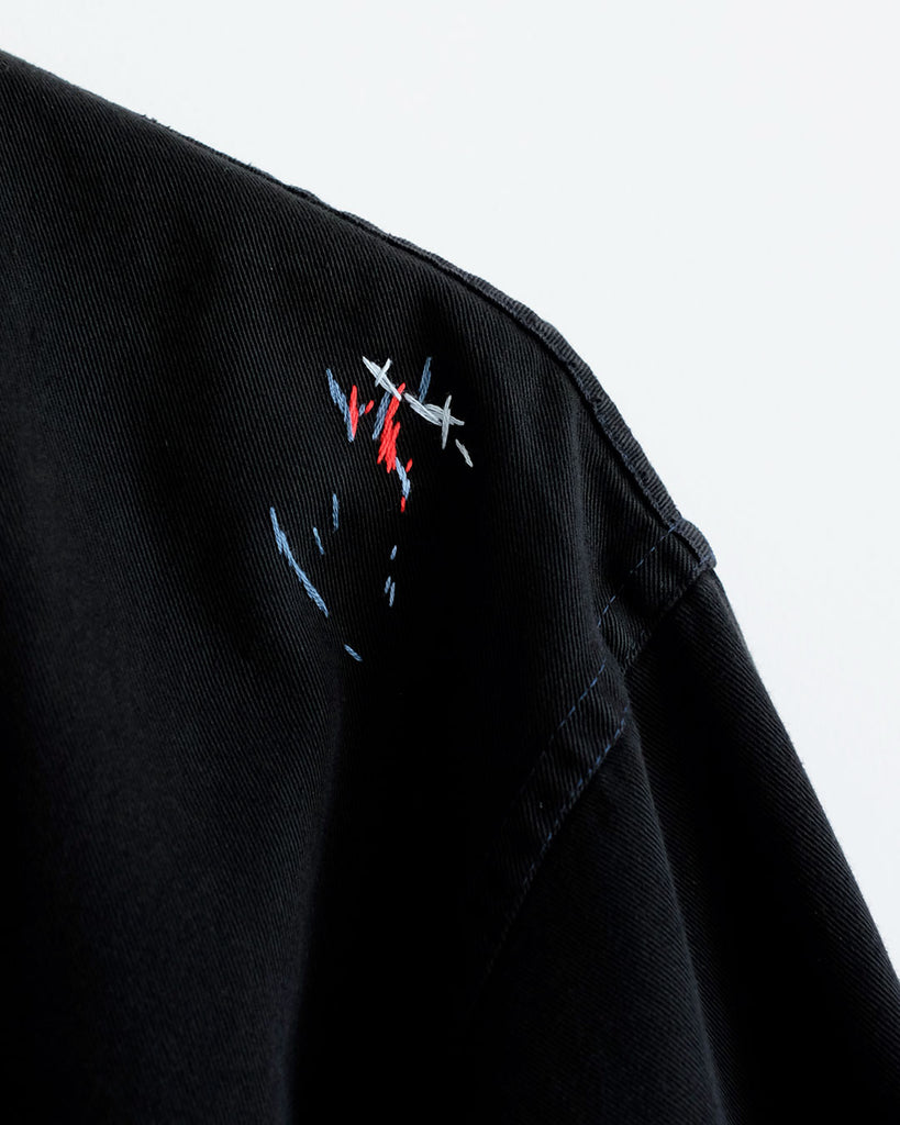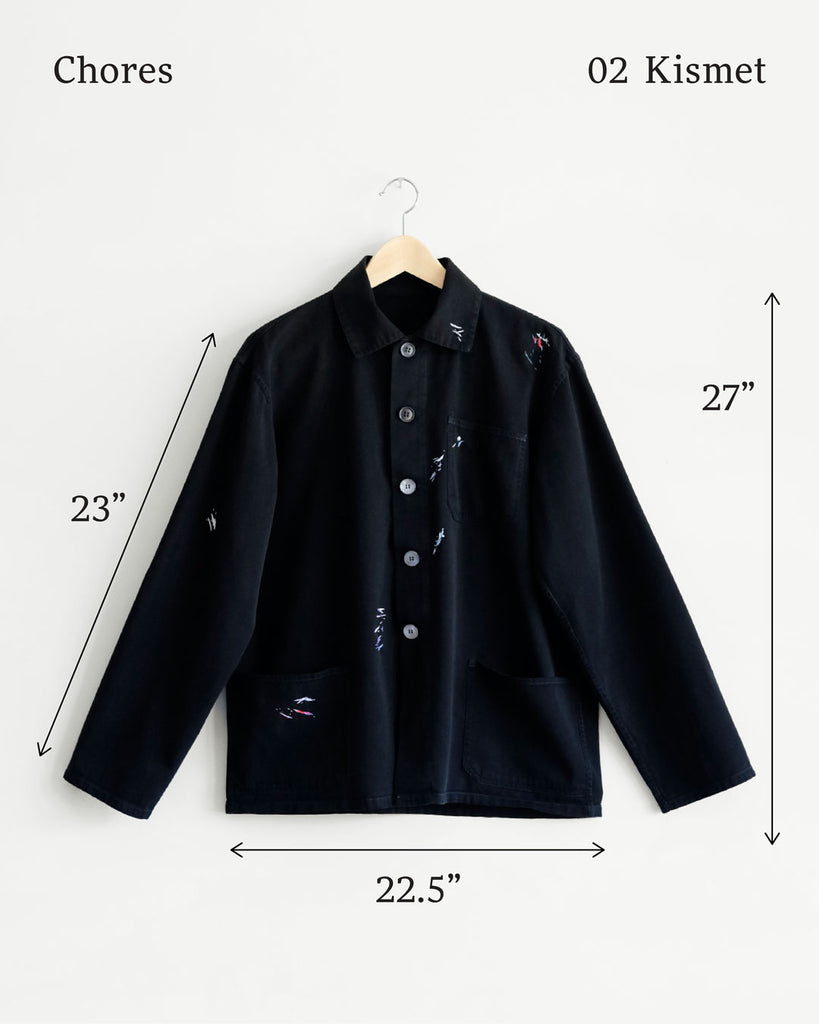 Chores is a collection of eighteen hand-embroidered vintage chore coats, celebrating the beauty of earnest labor. Because each piece is a vintage garment transformed through hand-embroidery, each piece is unique.