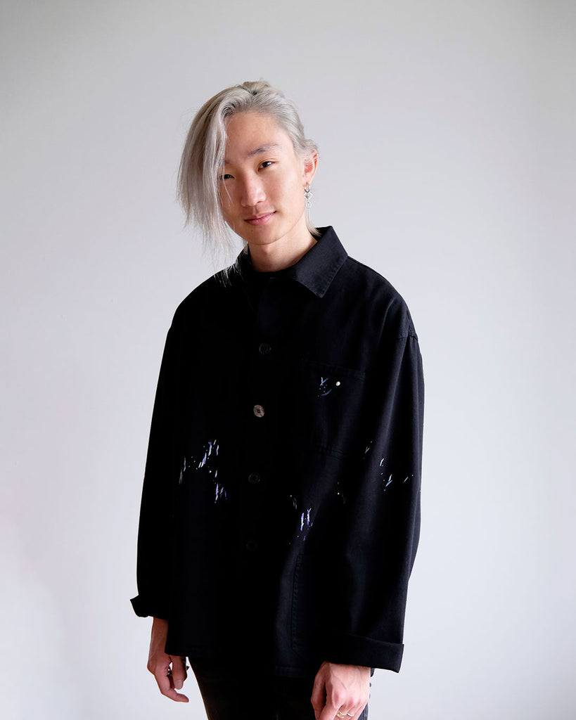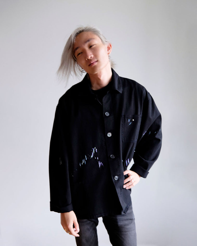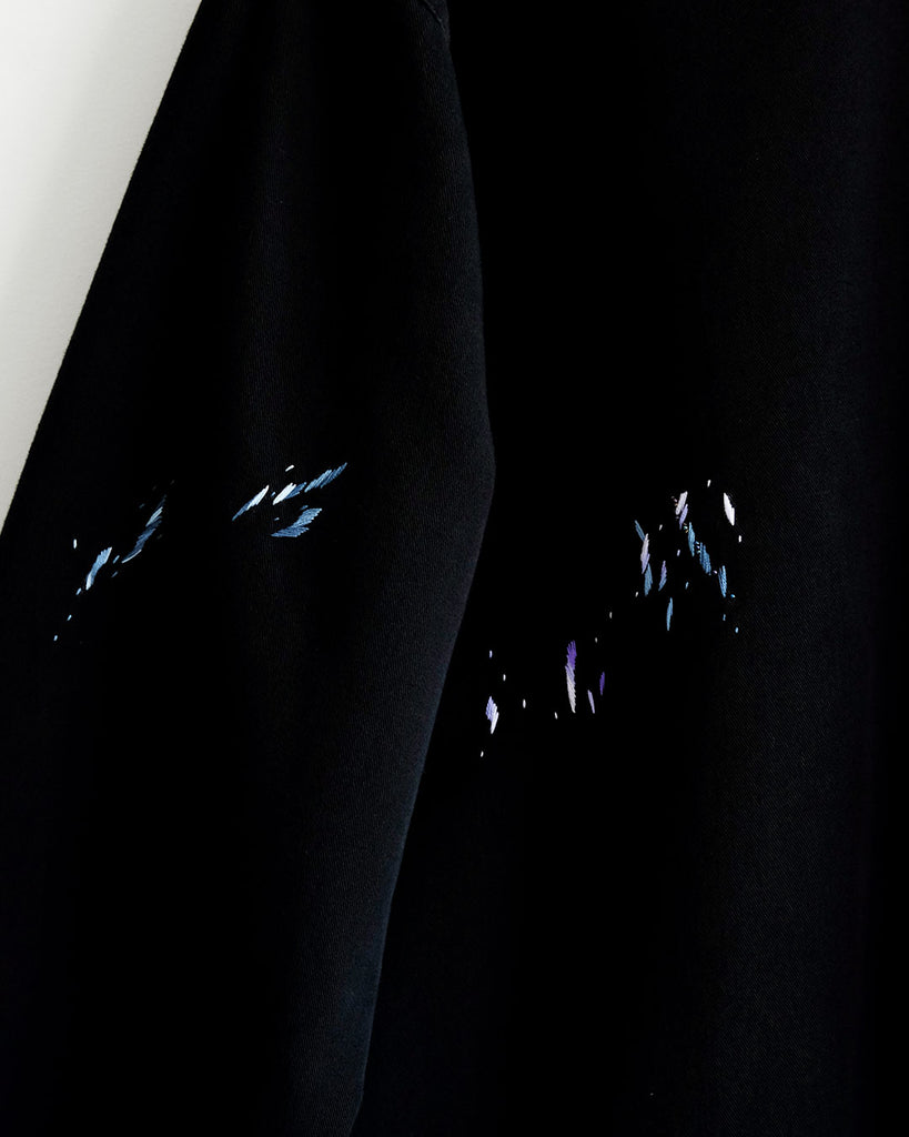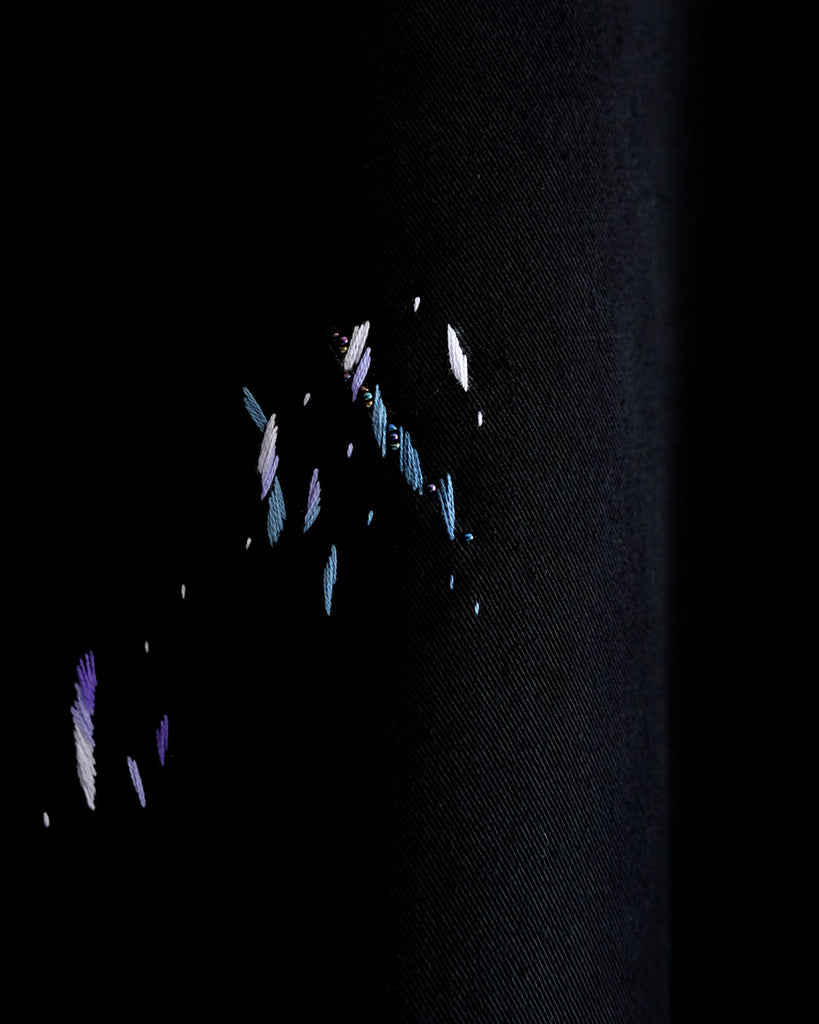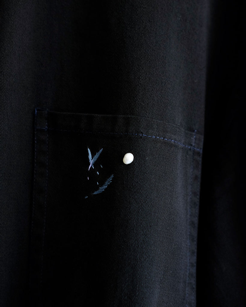 Scattered with stitches across body and sleeve, front and back, The Wanderer’s beautifully fragmented design speaks to the quiet wonder of moving through the world without expectation but with great intention. The coat features a cool color palette of purples and blues with moments of pale green, beaded accents across the patches of embroidery, and a baroque pearl at the single heart-side breast pocket.