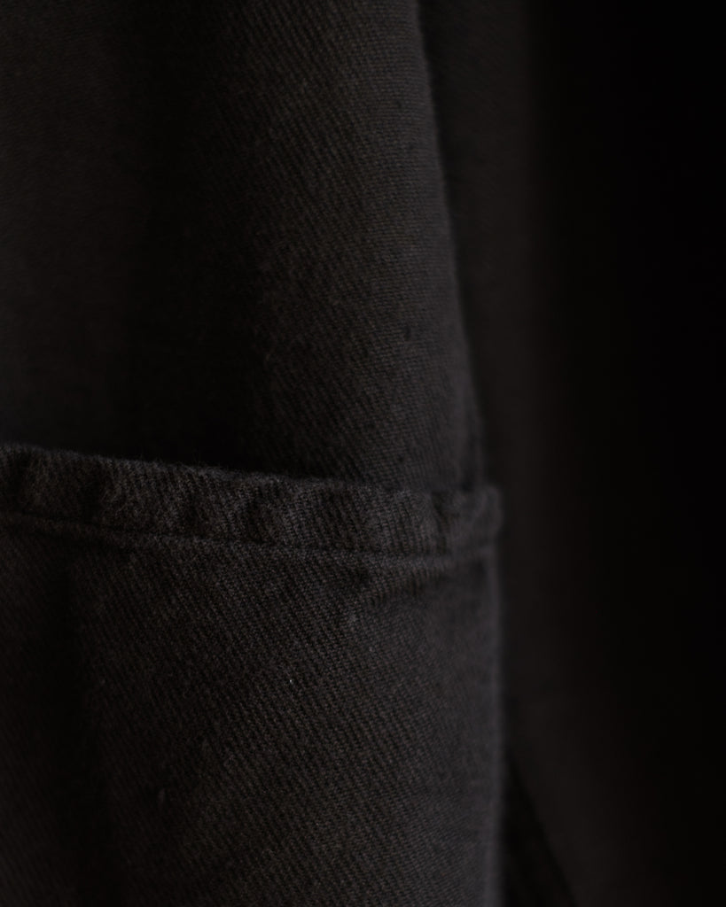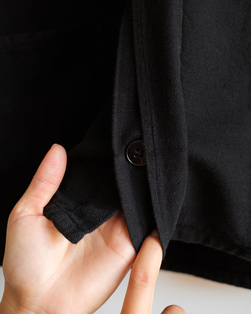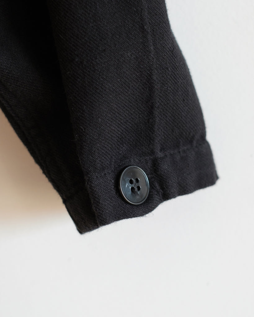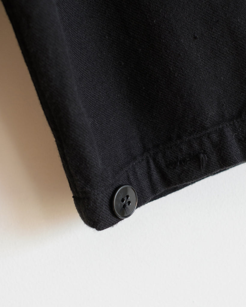 The fabric is a midweight cotton flannel with a brushed texture and black stitching, worn-in and very soft. It is in good condition, with some light all-over pilling but no noticeable wear and tear. The garment has an invisible button placket along center front, as well as pleated buttonhole closures at both wrists which can be used to cinch the sleeve hem (see photos).