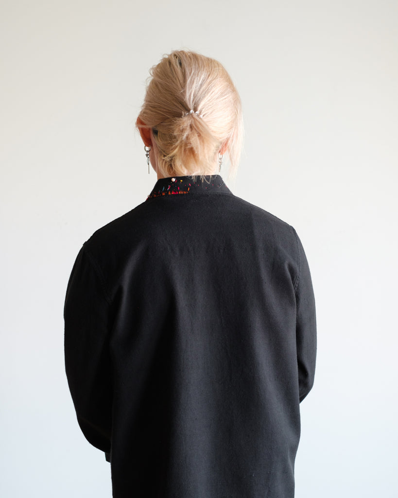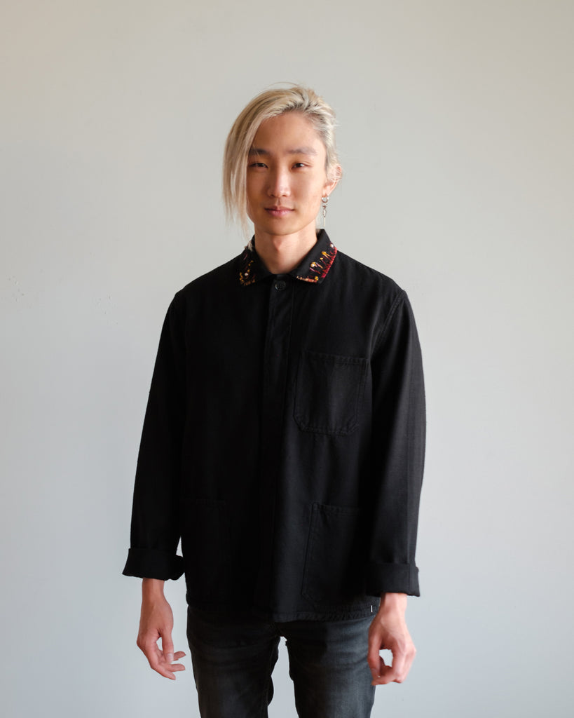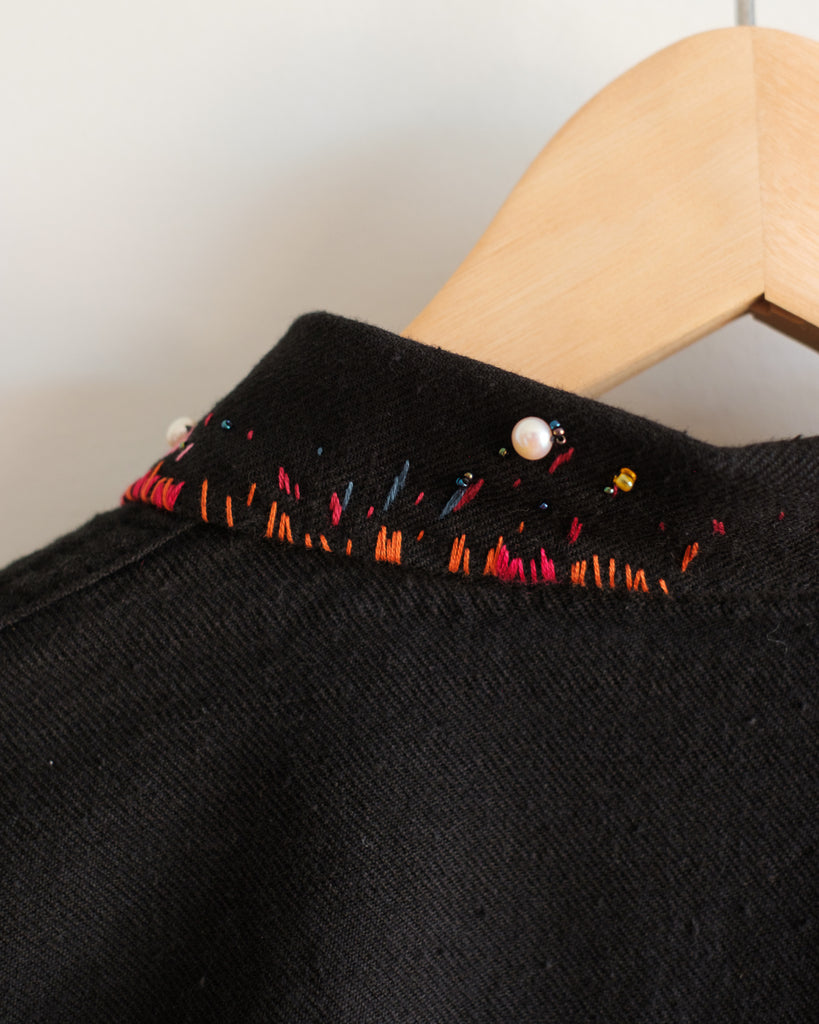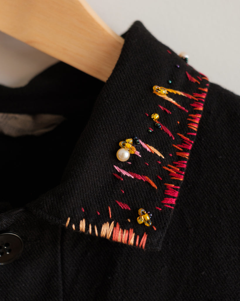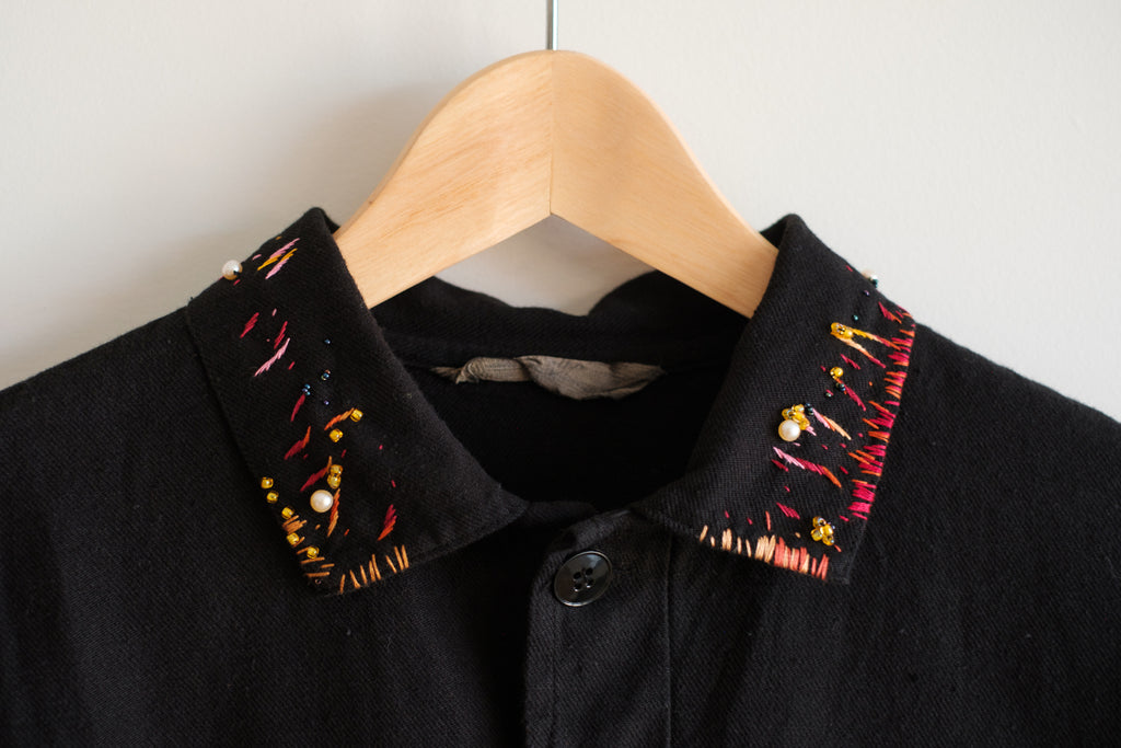 Chores is a collection of eighteen hand-embroidered vintage chore coats, celebrating the beauty of earnest labor. Each piece is a vintage garment transformed through a unique pattern of hand-embroidery, inspired by the unintentional yet beautiful splatters left on an old painting smock.