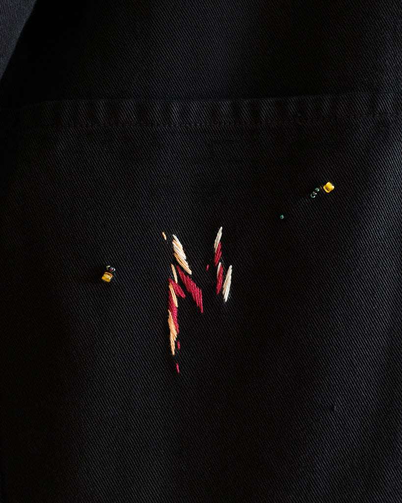 Chores is a collection of eighteen hand-embroidered vintage chore coats, celebrating the beauty of earnest labor. Each piece is a vintage garment transformed through a unique pattern of hand-embroidery, inspired by the unintentional yet beautiful splatters left on an old painting smock.