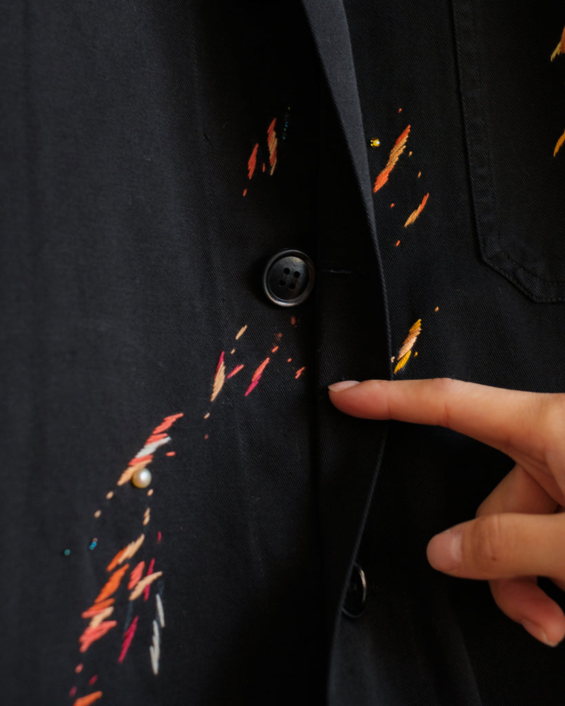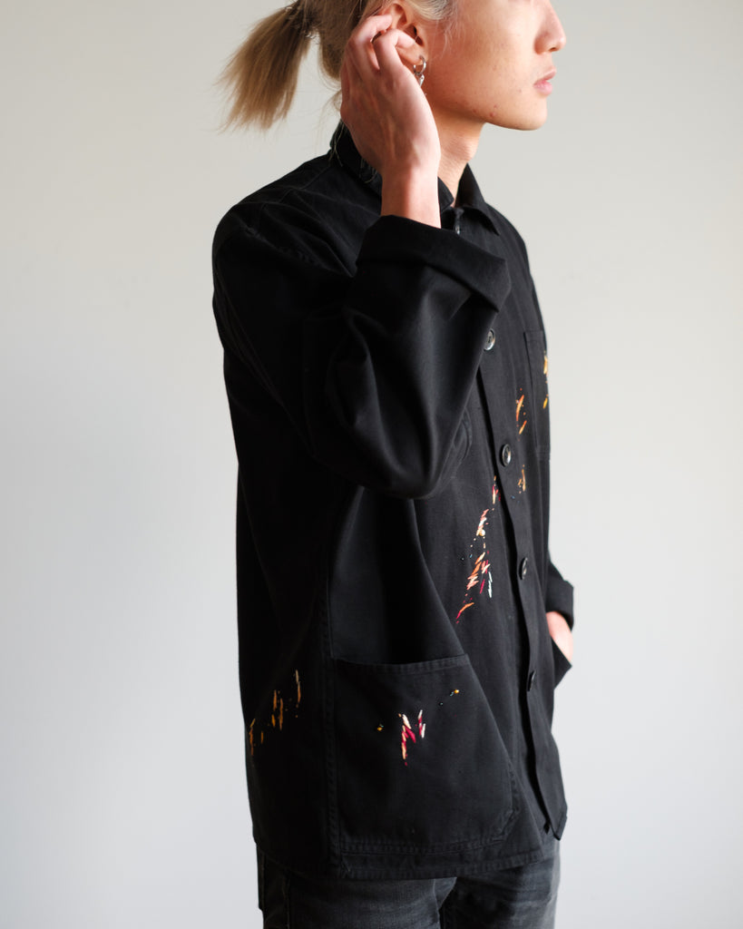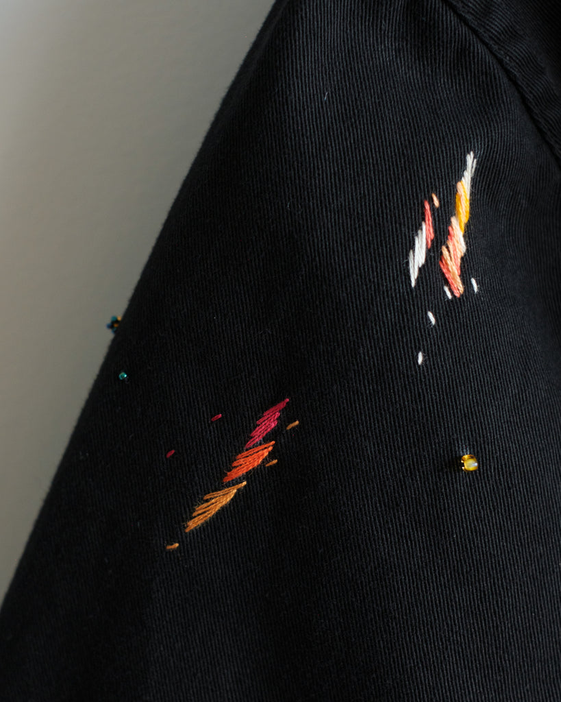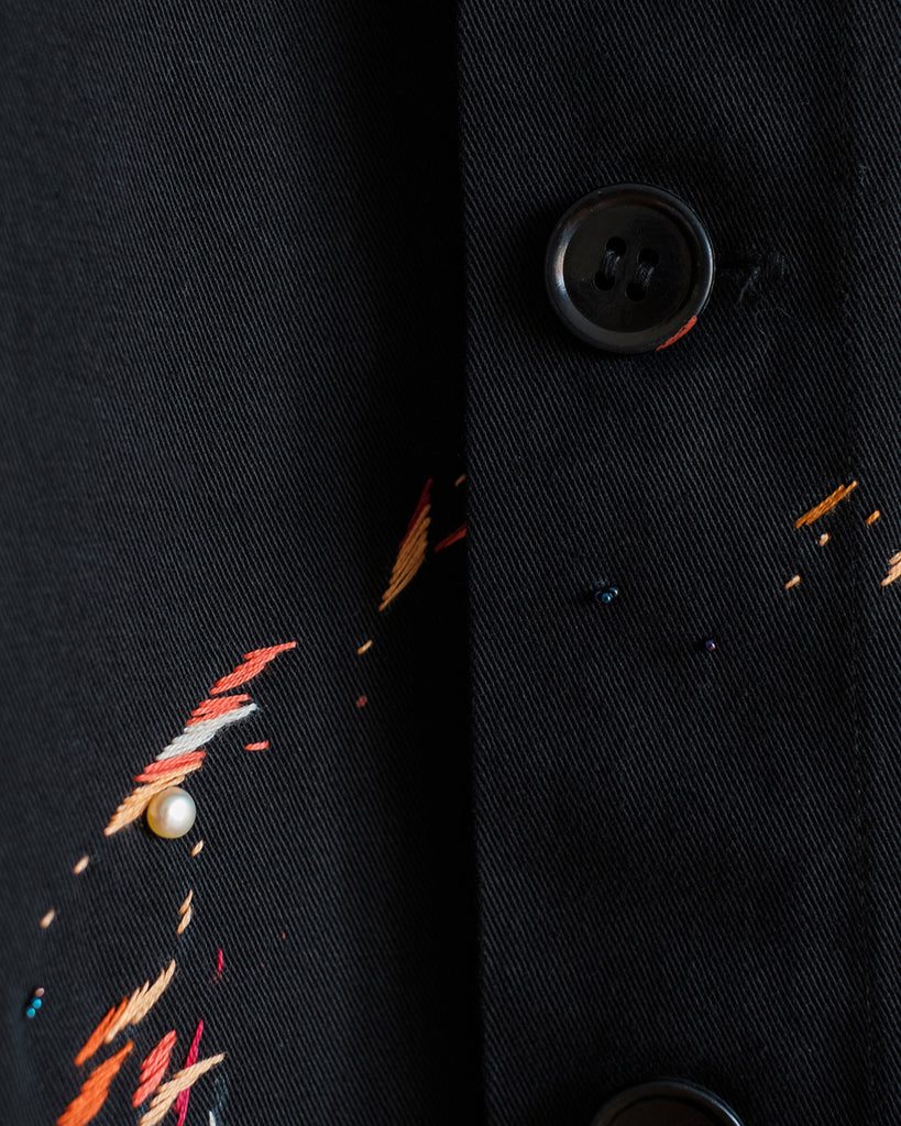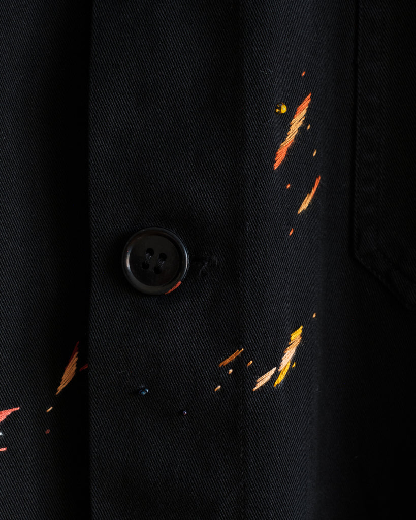 The fabric is a midweight cotton twill with black stitching, hard-wearing with a structured drape. It is in great condition, with no noticeable wear and tear except for two subtle reddish-orange paint stains (one near the right wrist, and one on the third button). The embroidery is designed to accompany these original paint stains.