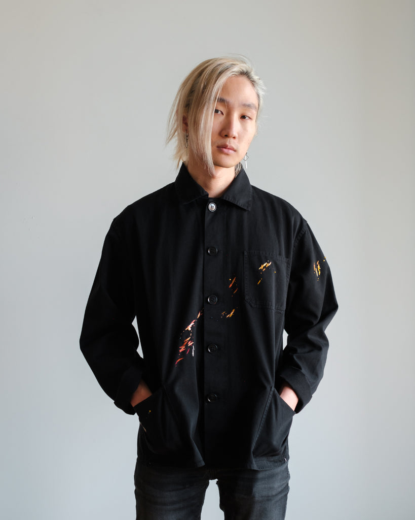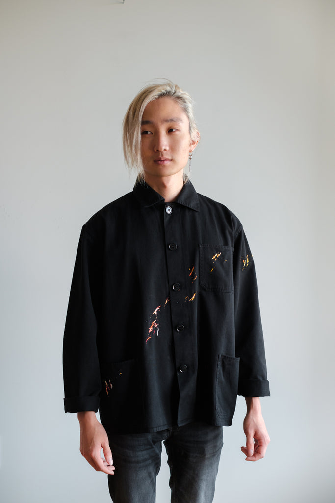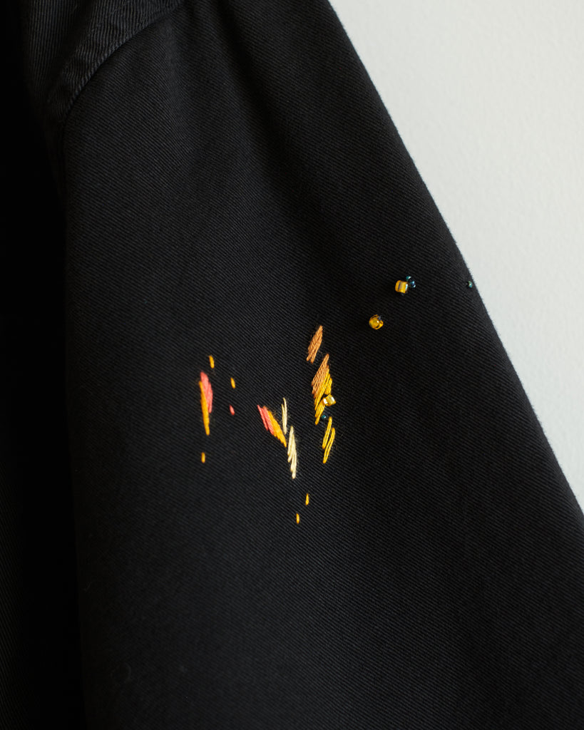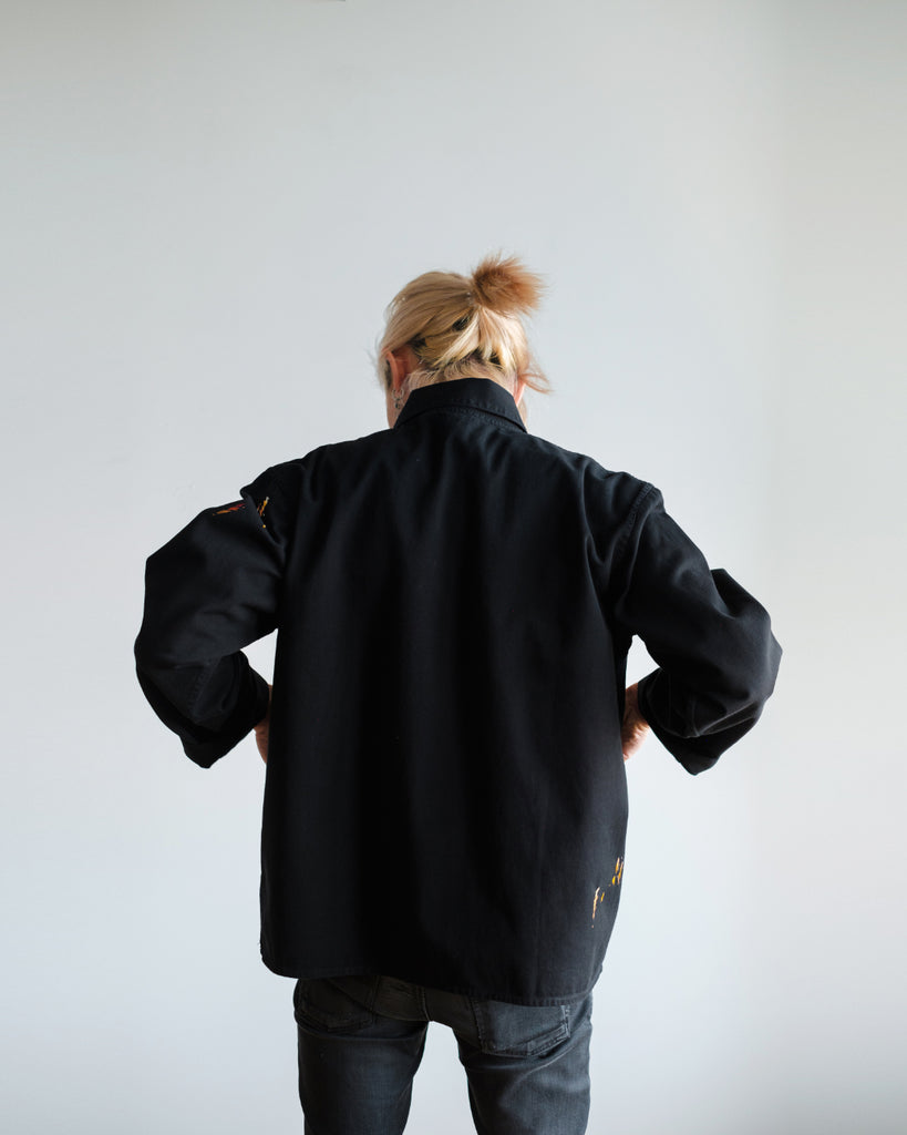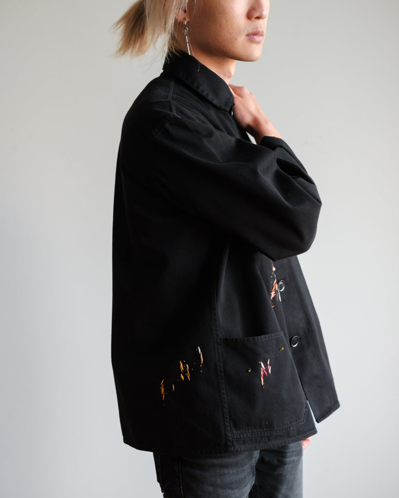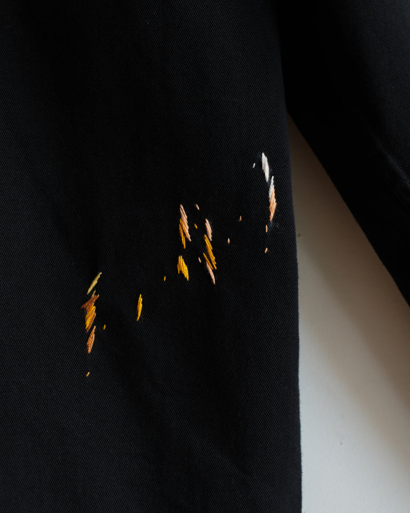 The fabric is a midweight cotton twill with black stitching, hard-wearing with a structured drape. It is in great condition, with no noticeable wear and tear except for two subtle reddish-orange paint stains (one near the right wrist, and one on the third button). The embroidery is designed to accompany these original paint stains.