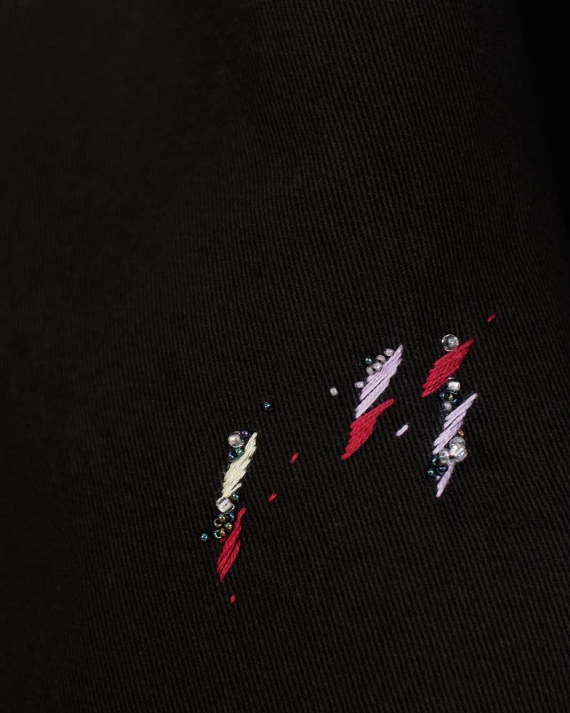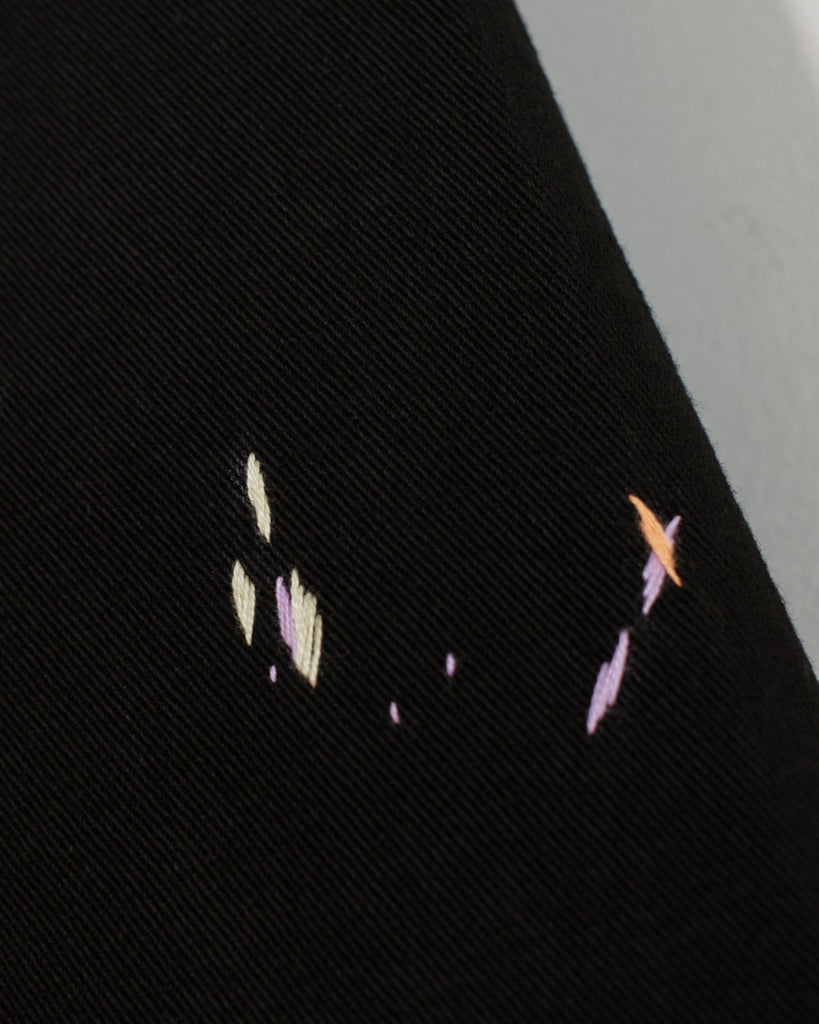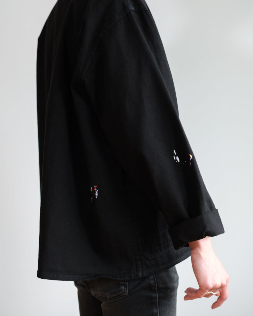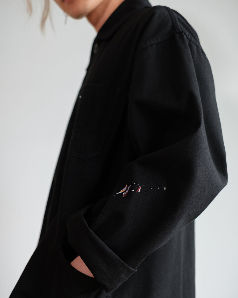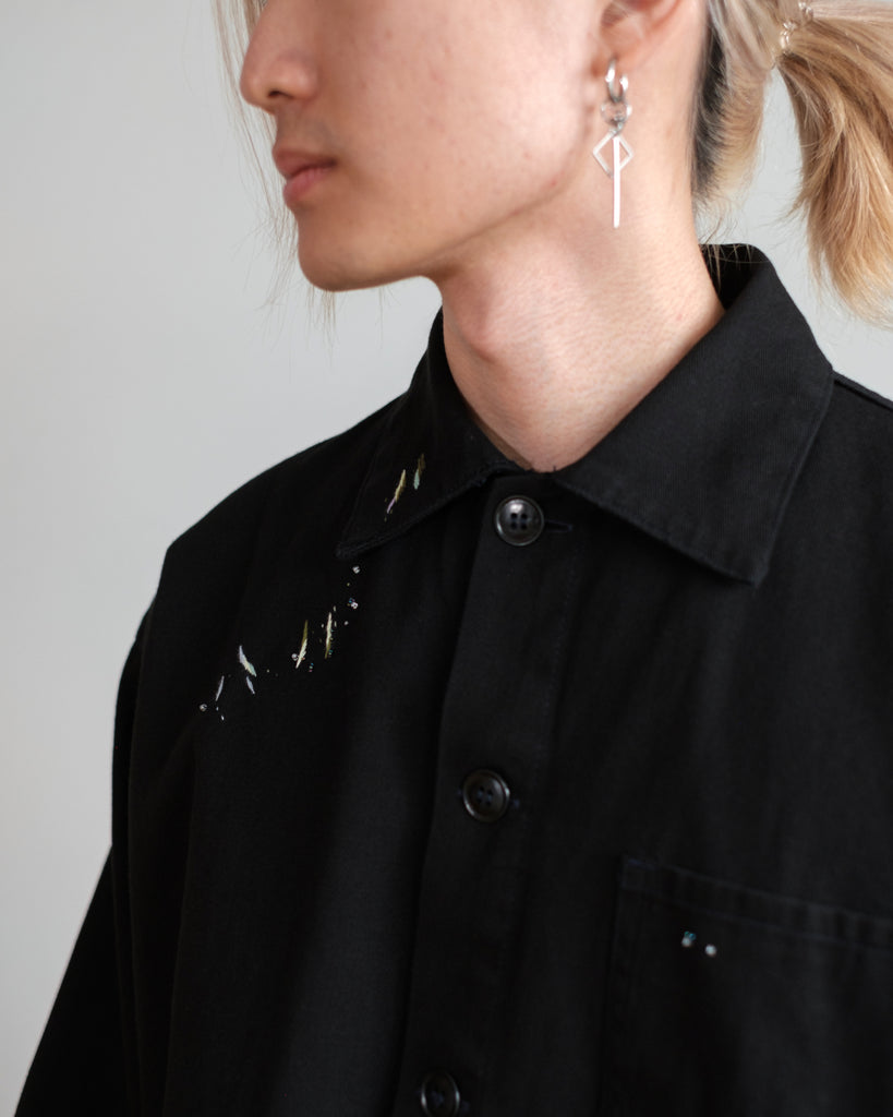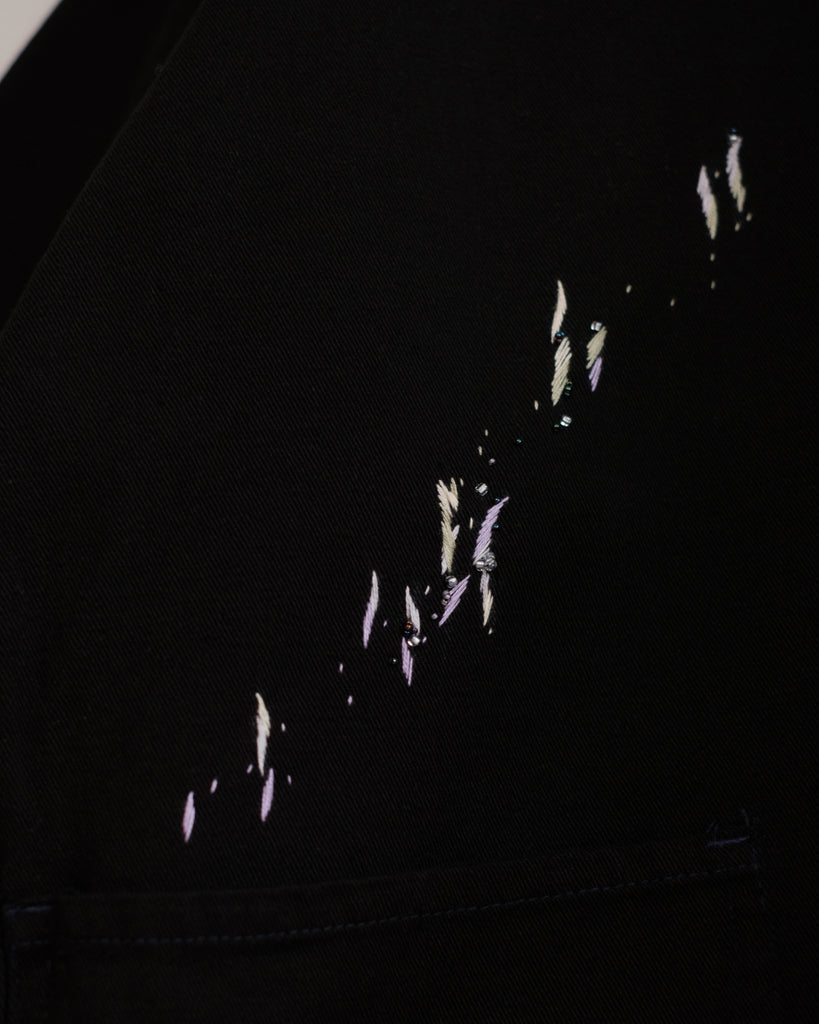 Chores is a collection of eighteen hand-embroidered vintage chore coats, celebrating the beauty of earnest labor. Each piece is a vintage garment transformed through a unique pattern of hand-embroidery and beading, inspired by the unintentional yet beautiful splatters left on an old painting smock.
