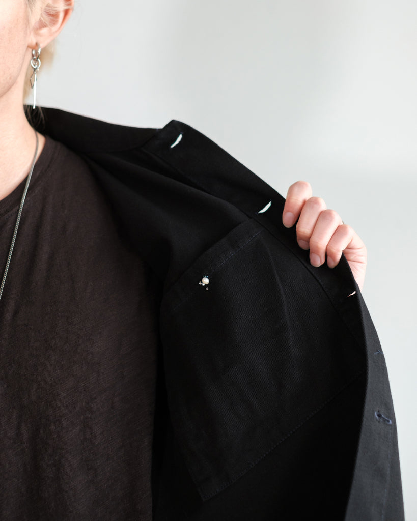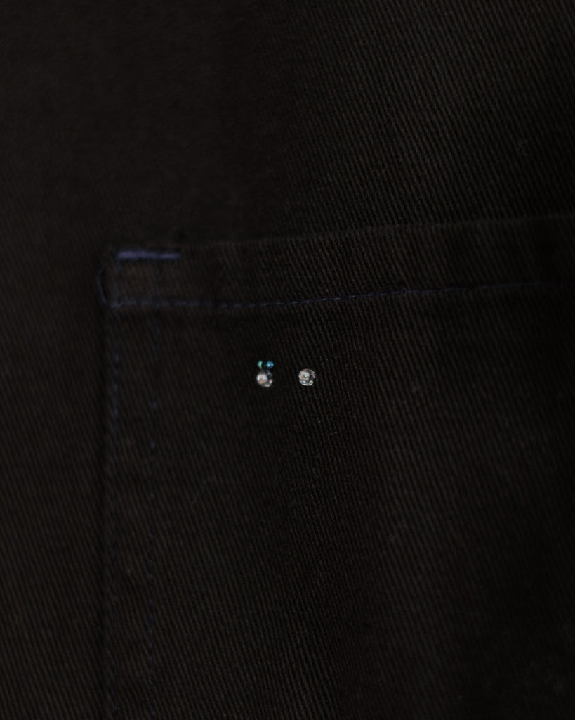 The fabric is a heavyweight cotton twill with dark blue stitching, hard-wearing with a structured drape. There is a hidden interior pocket on the wearer's left side, bearing a single baroque pearl. It is in great condition, with no noticeable wear and tear.