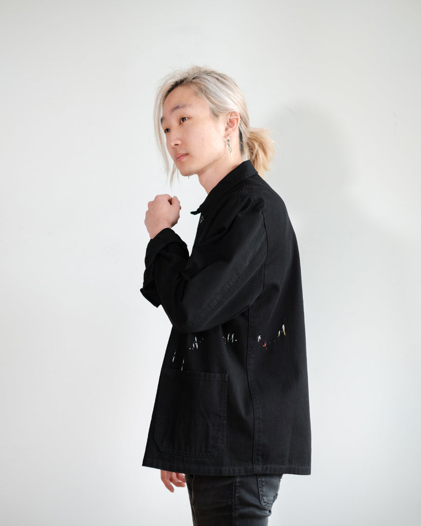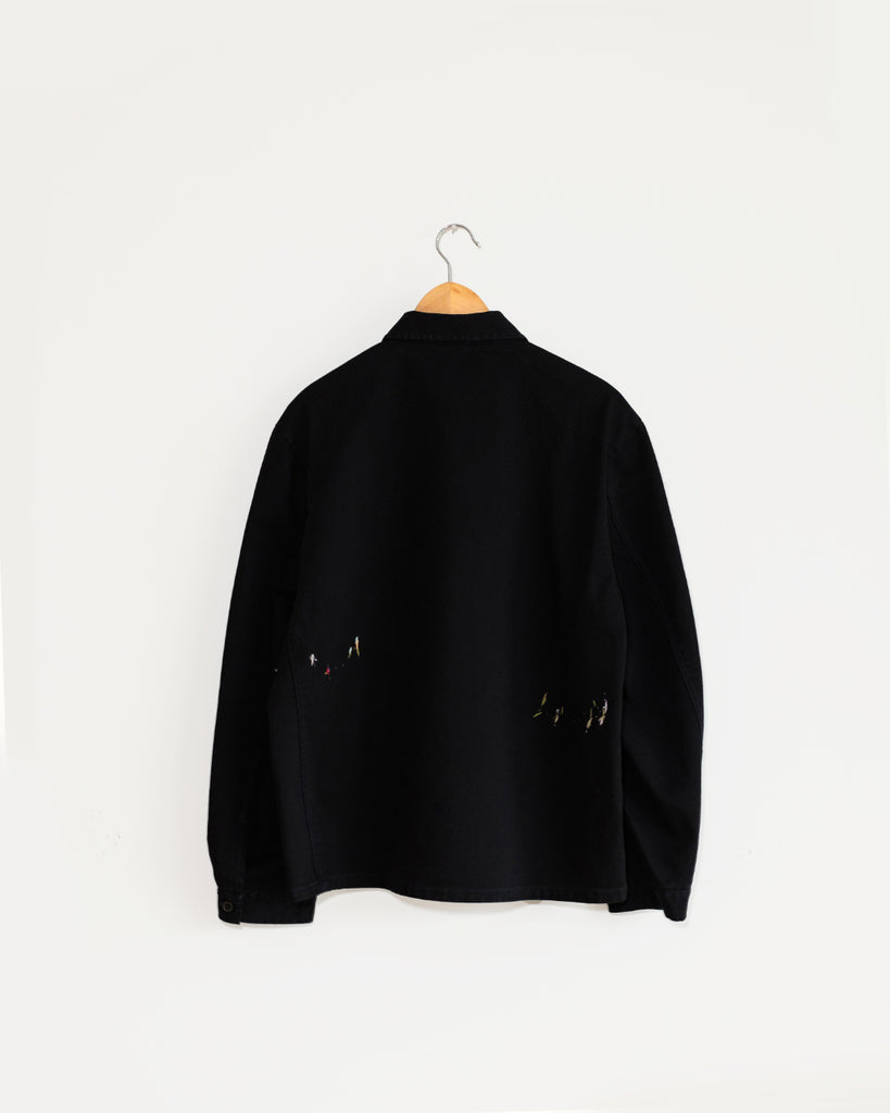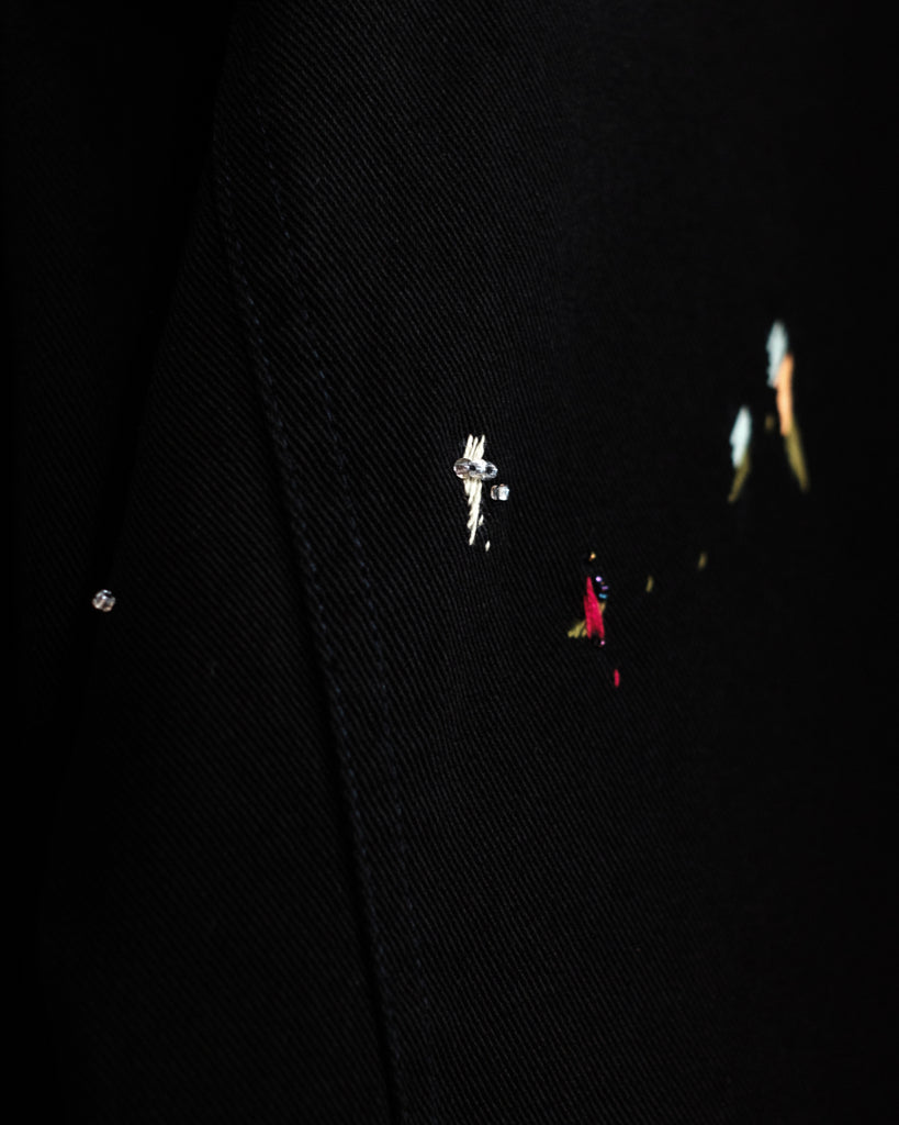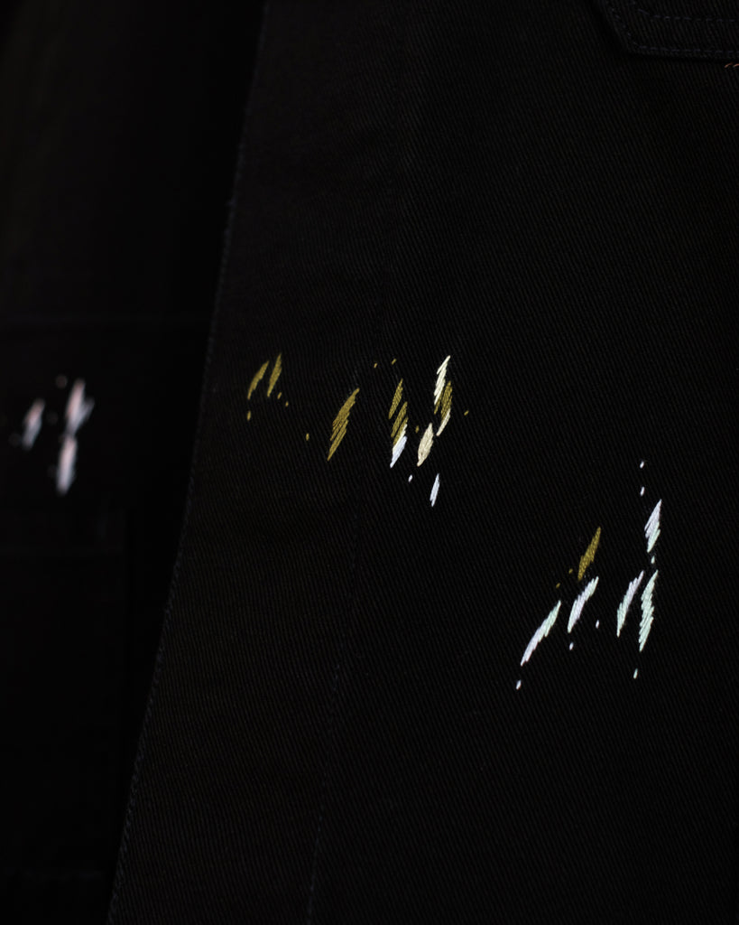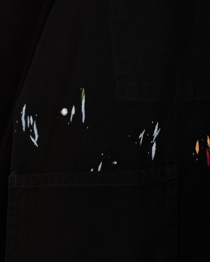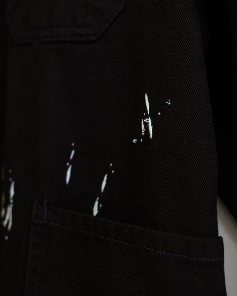 Chores is a collection of eighteen hand-embroidered vintage chore coats, celebrating the beauty of earnest labor. Each piece is a vintage garment transformed through a unique pattern of hand-embroidery and beading, inspired by the unintentional yet beautiful splatters left on an old painting smock.