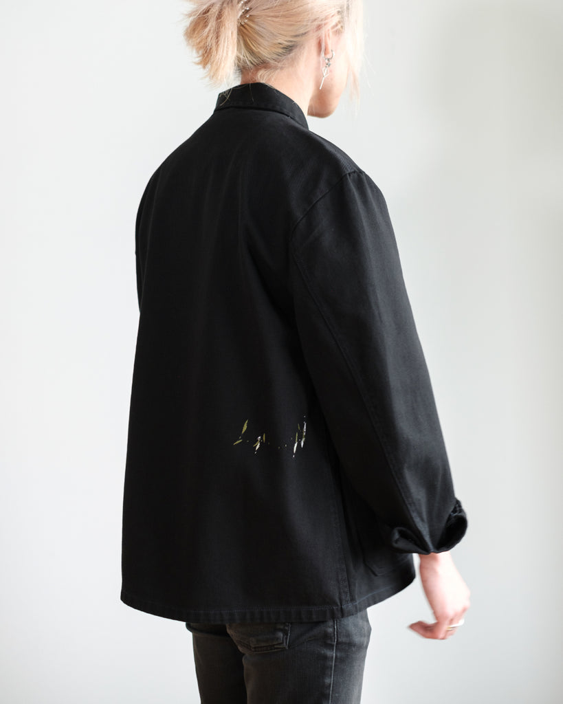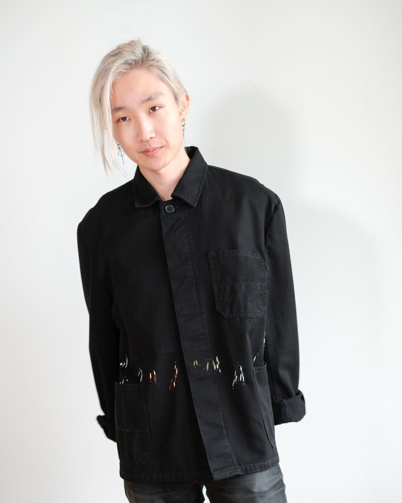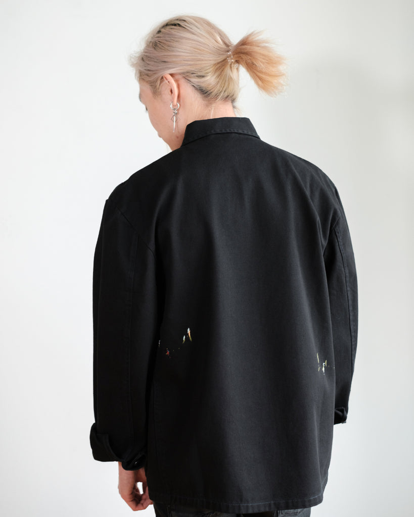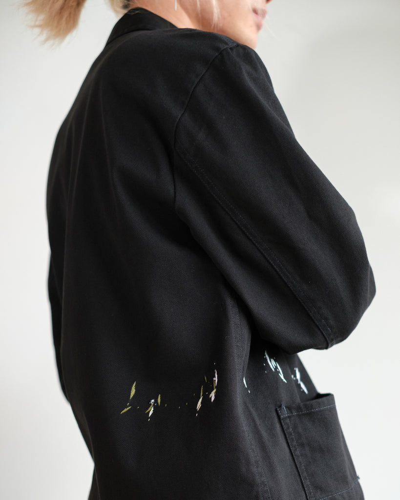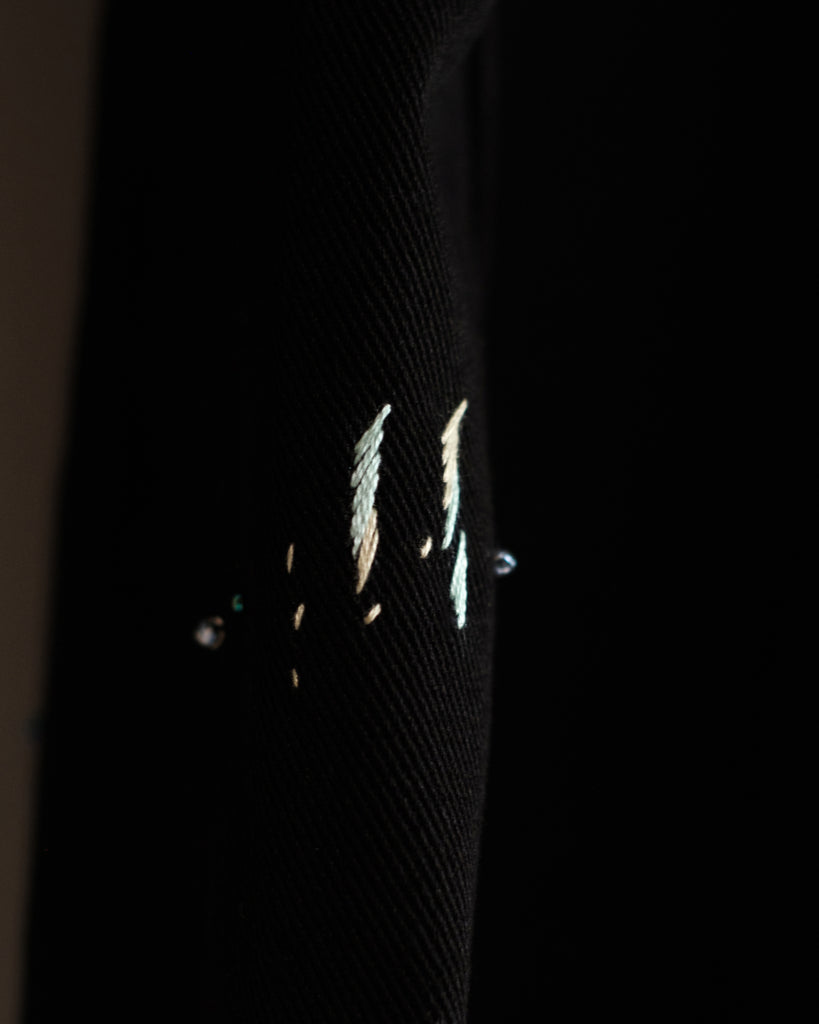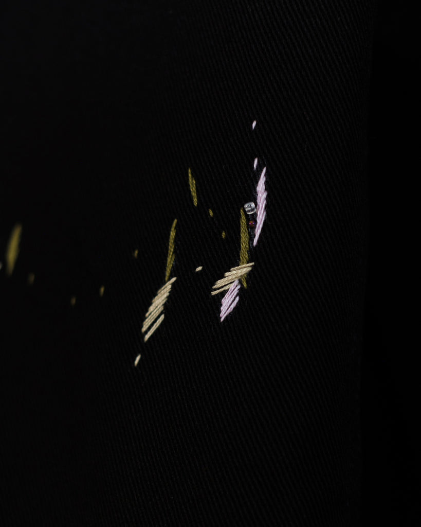 Chores is a collection of eighteen hand-embroidered vintage chore coats, celebrating the beauty of earnest labor. Each piece is a vintage garment transformed through a unique pattern of hand-embroidery and beading, inspired by the unintentional yet beautiful splatters left on an old painting smock.