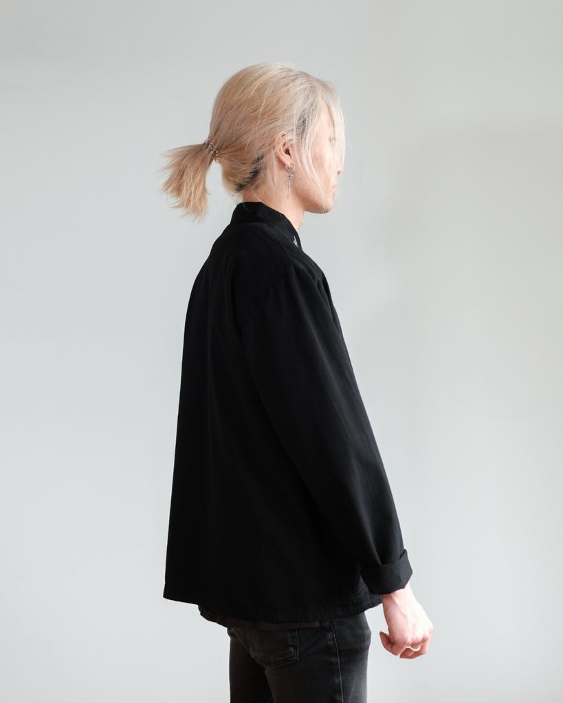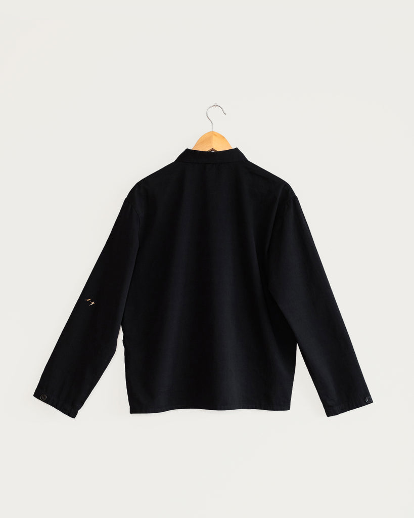 The fabric is a lightweight cotton twill with black stitching. There is an invisible button placket at center front, and an adjustable pleated button closure at sleeve hems. It is in great condition, with no noticeable wear and tear.