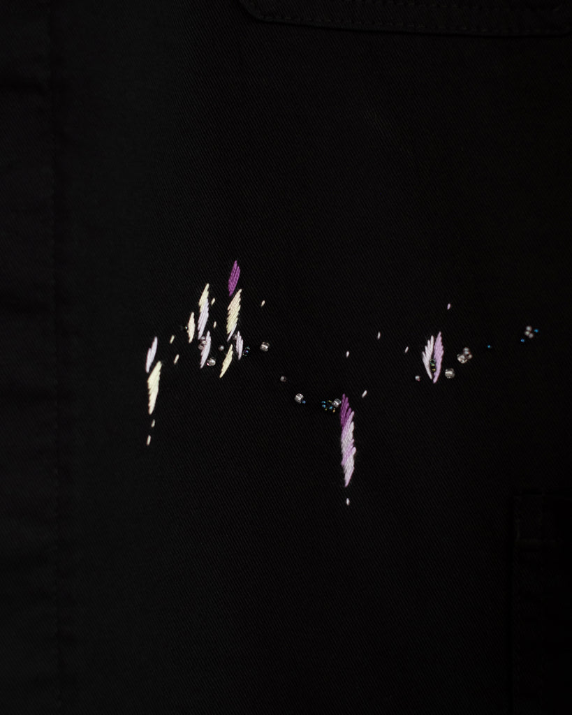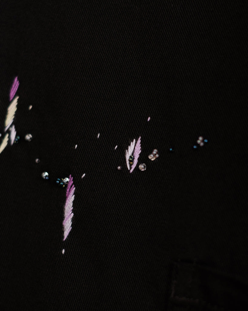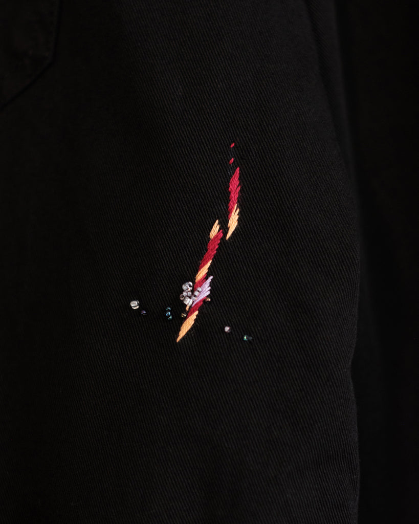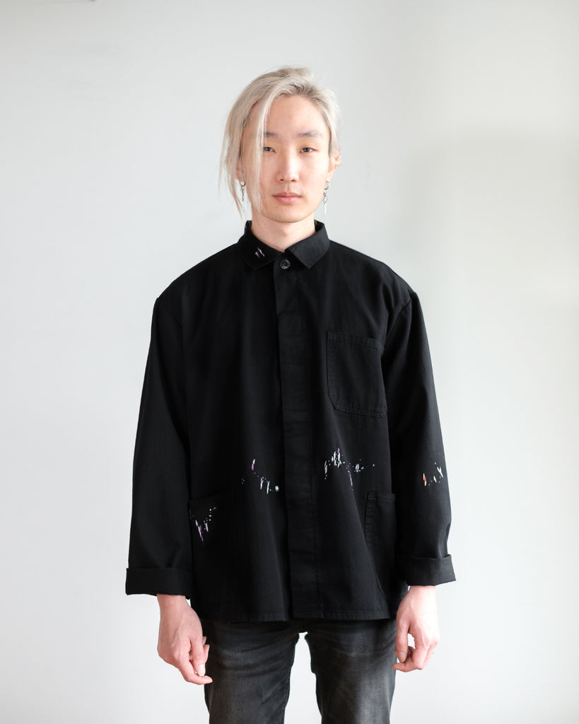 Chores is a collection of eighteen hand-embroidered vintage chore coats, celebrating the beauty of earnest labor. Each piece is a vintage garment transformed through a unique pattern of hand-embroidery and beading, inspired by the unintentional yet beautiful splatters left on an old painting smock.