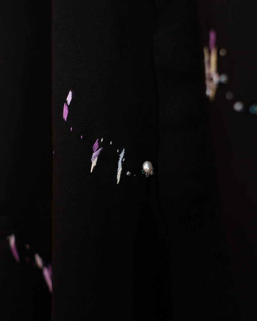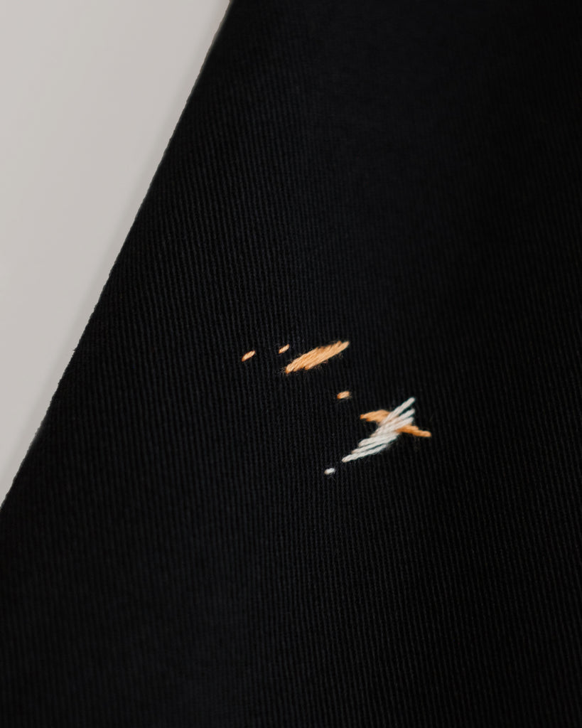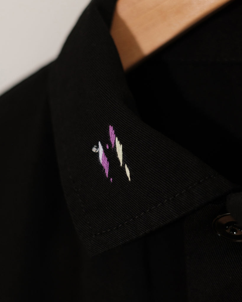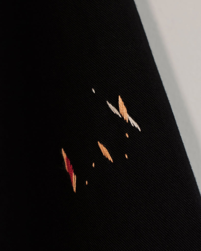 Chores is a collection of eighteen hand-embroidered vintage chore coats, celebrating the beauty of earnest labor. Each piece is a vintage garment transformed through a unique pattern of hand-embroidery and beading, inspired by the unintentional yet beautiful splatters left on an old painting smock.