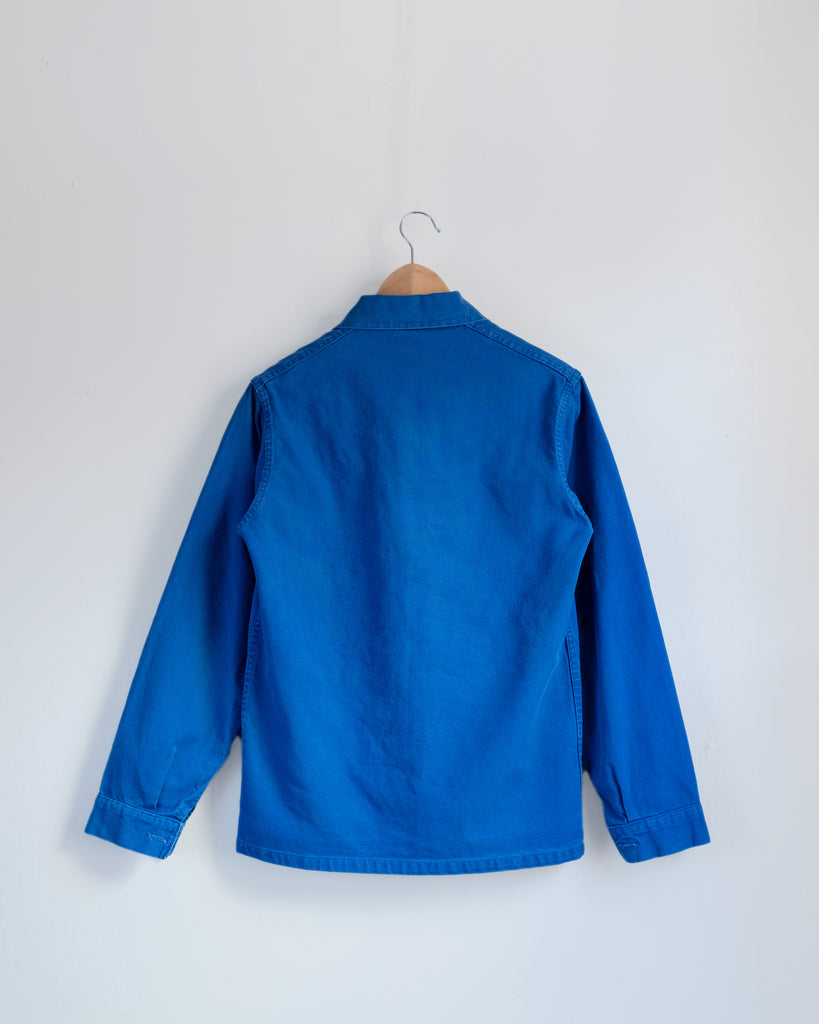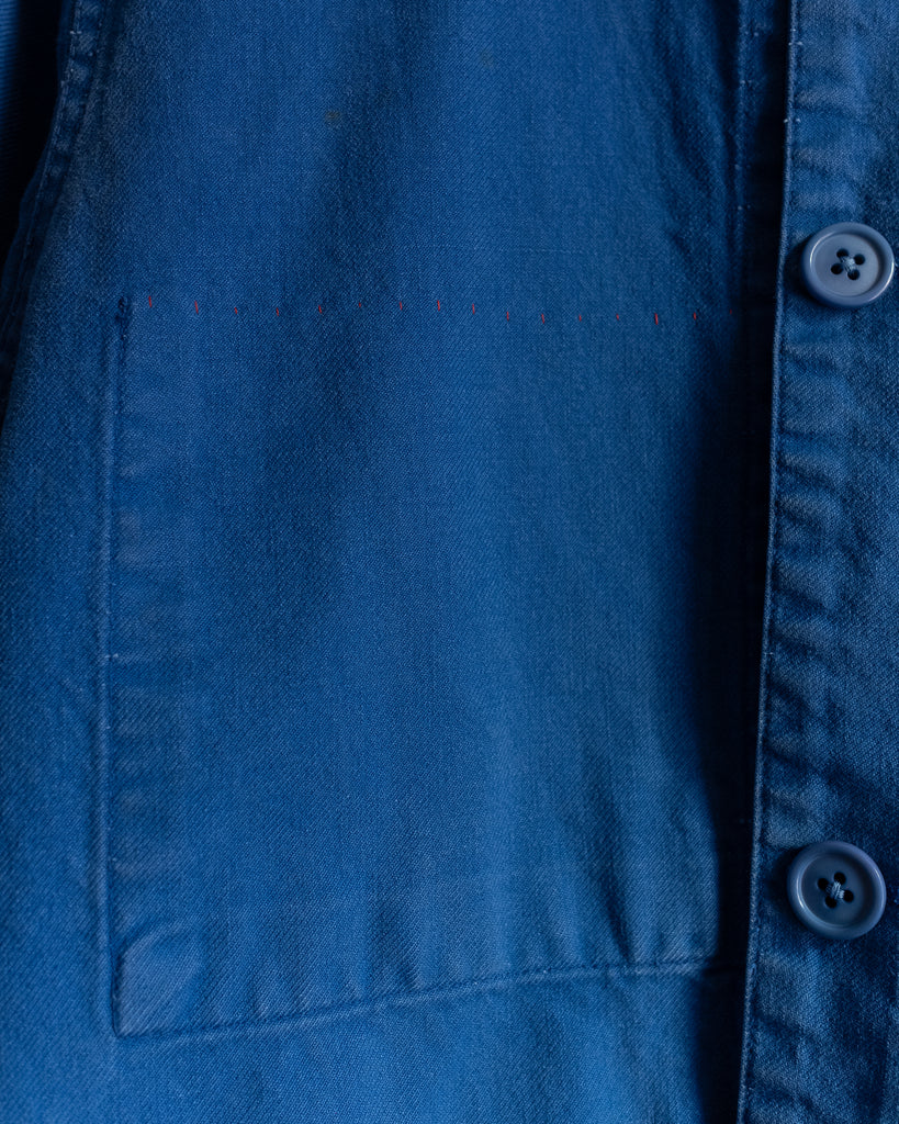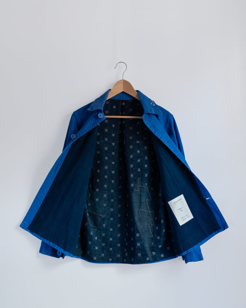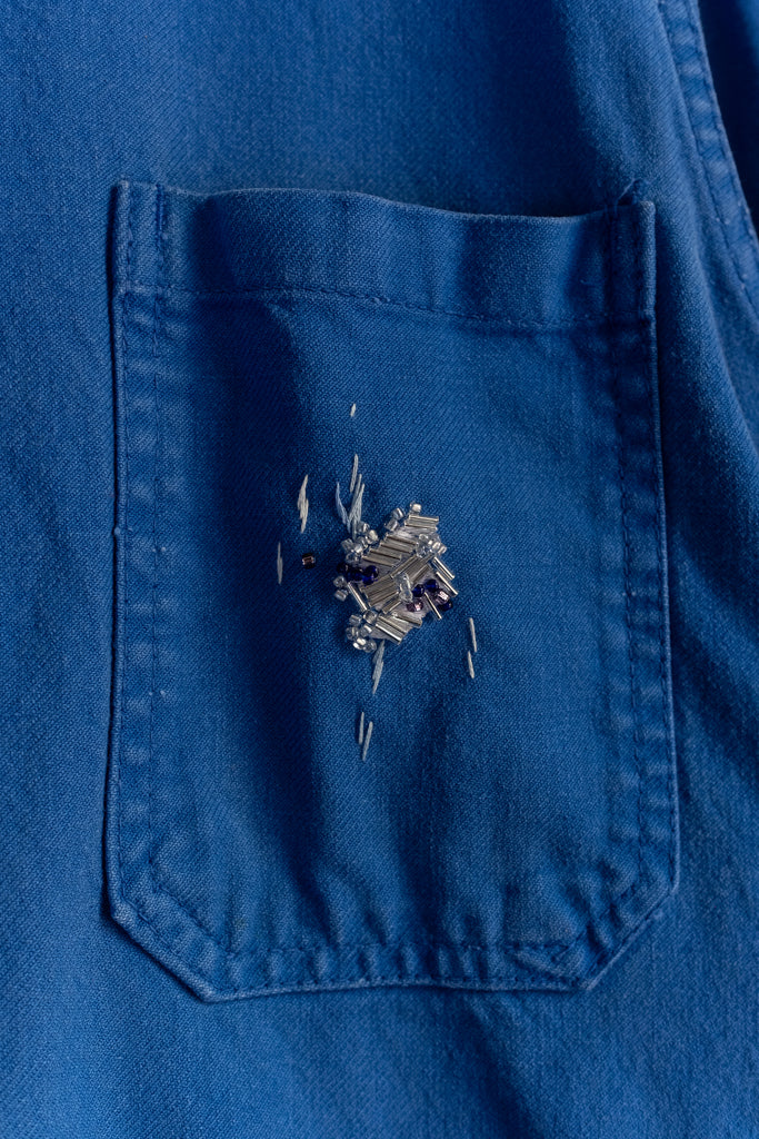Garment measures 41" cross chest (side seam to side seam), 27.5" body length (high point shoulder to hem). Made from a vintage 100% cotton chore coat, cotton embroidery floss, glass beads, and lining reconstructed from antique indigo-dyed cotton fabric scraps. Please dry clean or hand wash cold with mild detergent and line dry, warm iron on reverse with a little steam.