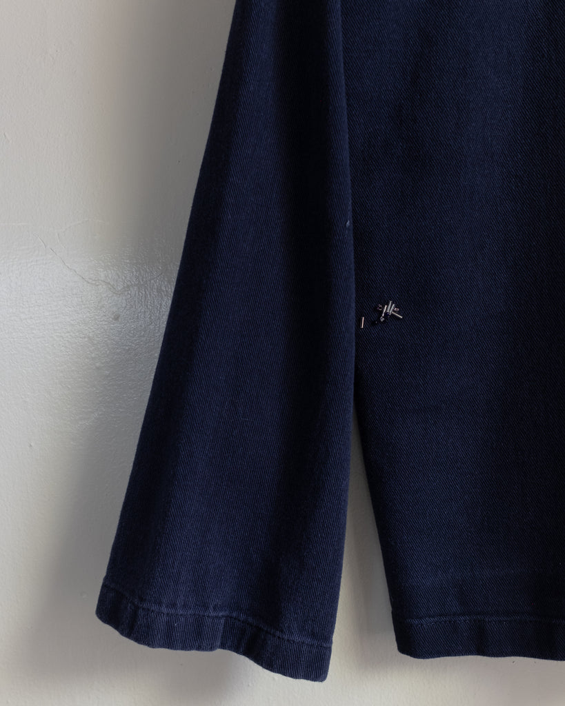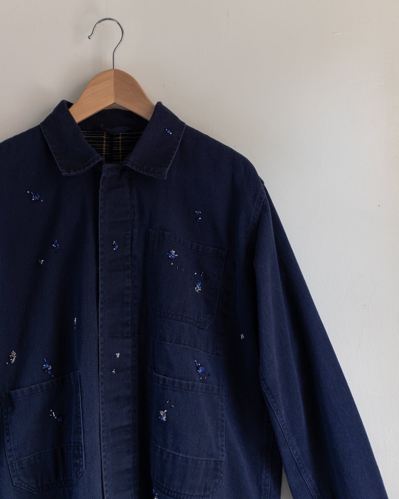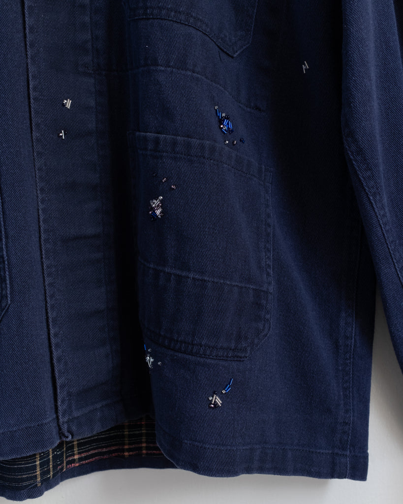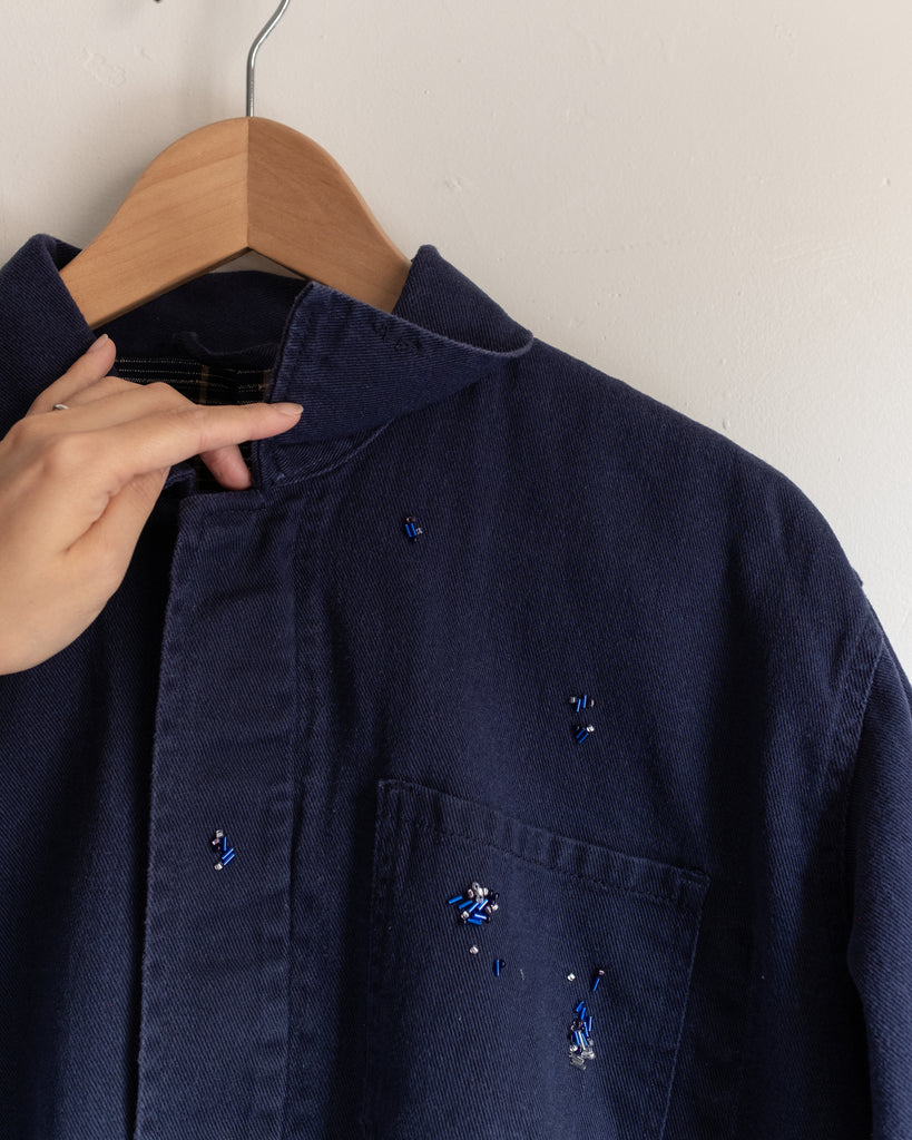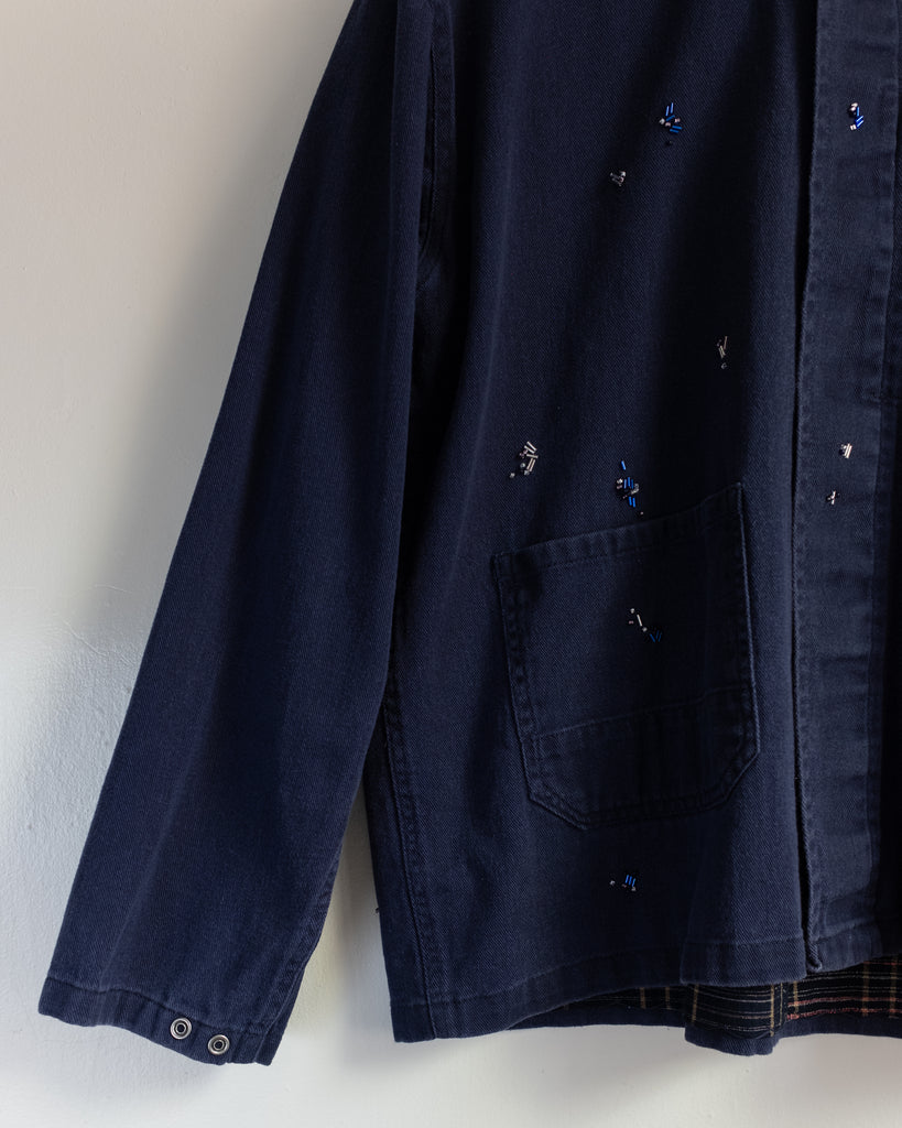 Garment measures 48" cross chest (side seam to side seam), 25" body length (high point shoulder to hem). Made from a vintage 100% cotton chore coat, cotton embroidery floss, glass beads, and lining reconstructed from antique indigo-dyed cotton fabric scraps. Please dry clean or hand wash cold with mild detergent and line dry, warm iron on reverse with a little steam.