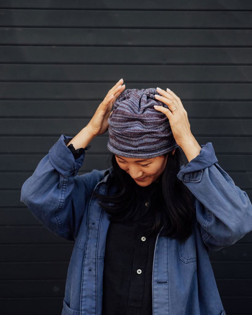 With its droopy crinkles and deep berry color, this tender hat is surprisingly versatile while still holding a sweet strangeness within its folds. Variegated rows of color add texture to an already-textural piece for a low-key look that reveals its secrets as you get closer. The Blueberry Jam Beanie features a rolled hem and irregular wrinkles which help retain heat.