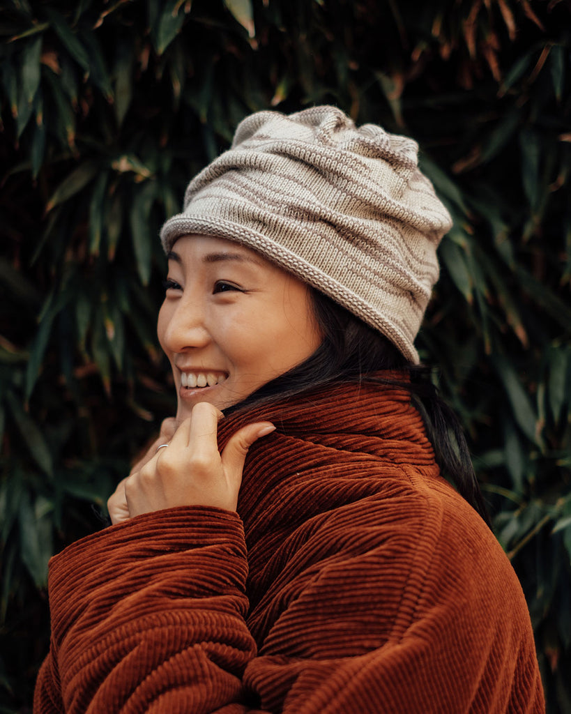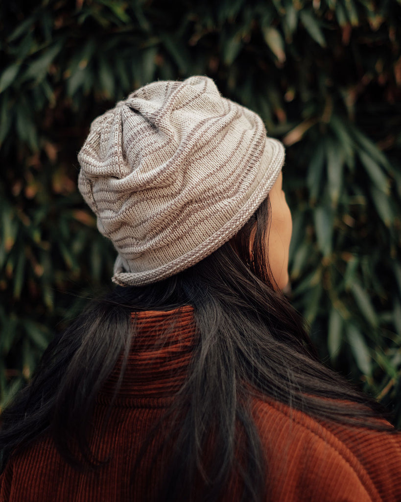 With its droopy crinkles and creamy color, this tender hat is surprisingly versatile while still holding a sweet strangeness within its folds. Variegated rows of color add texture to an already-textural piece for a low-key look that reveals its secrets as you get closer. The Tahini Beanie features a rolled hem and irregular wrinkles which help retain heat.