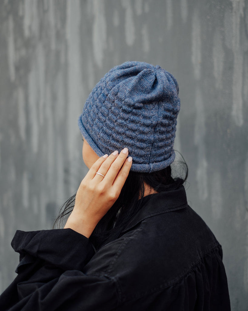 Understated, low-key, yet deliciously textured. Soft columns of rippled wool offer a multi-dimensional pattern to this single-tone berry-blue beanie - all while keeping its wearer warm beneath its knit ridges and rolled hem. The Tanghulu Beanie is an instant classic - or is it an ancient one? If you know you know.