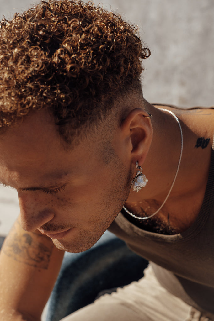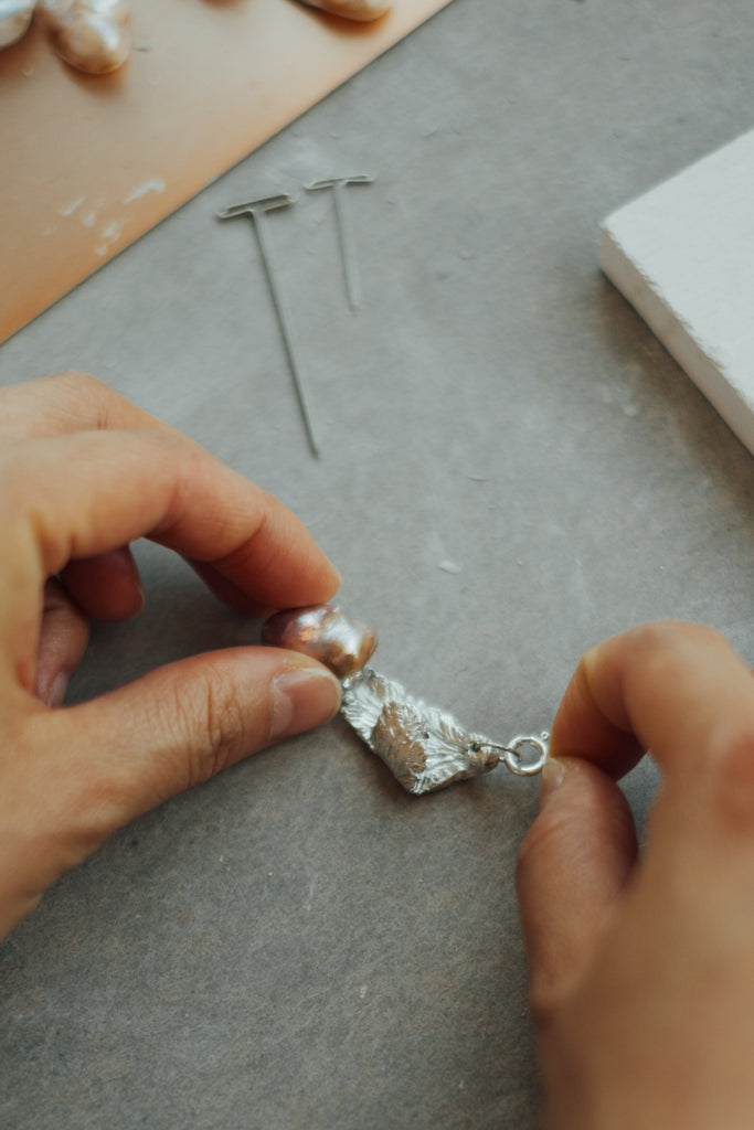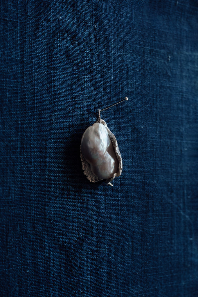 Each charm features a blister pearl held firmly — yet incredulously, as if defying the laws of physics — in place by sculpted silver. The unique silver clay process behind their union carries with it a record of touch and fluid motion solidified in time, each unreplicable, even by its maker.