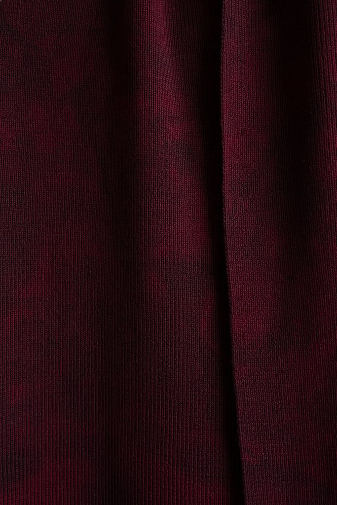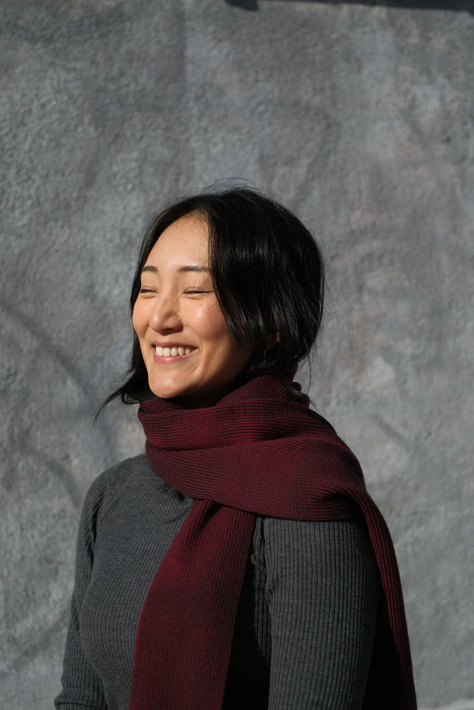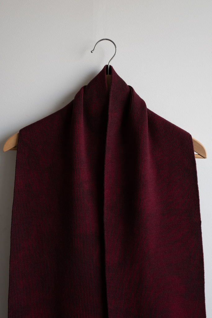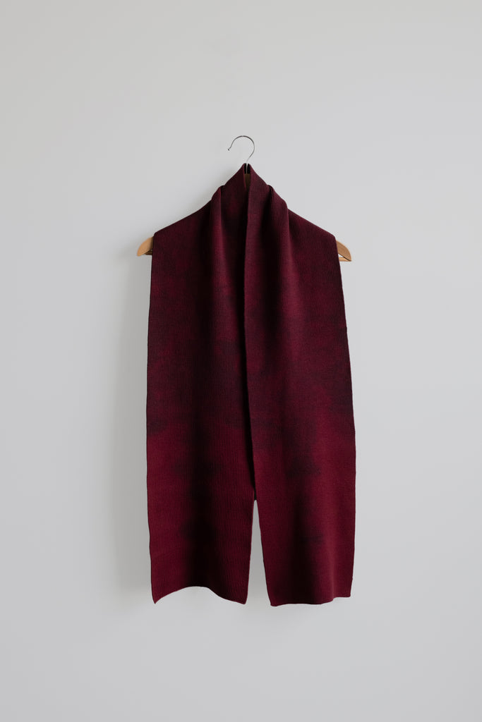 Unique within the collection for having the appearance of segments along its length, this piece asks both wearer and witness to interpret its double-tails — or perhaps double-heads? — that both appear as a strong dark spine streaking down the symmetrical red fields at each end of the scarf, similar but not the same. The two ends remain connected nonetheless by a subtler mottled body of misty commingled tones — making 07 Tail at once versatile and specific, curious and defined.